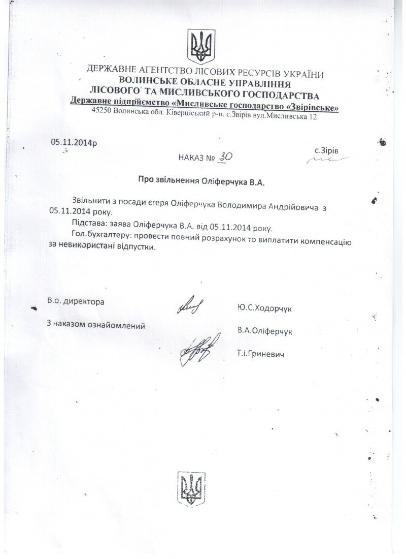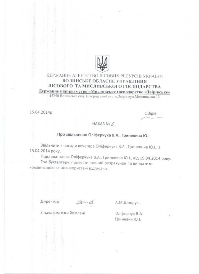 Активісти Самооборони Волині виявили, що на «Звіріському МГ», нібито, працювали кочегаром та єгерем Володимир Оліферчук та Юрій Гриневич й отримували нараховану заробітну плату головним бухгалтером. Останній, до речі, рідний брат головного бухгалтера Тетяни Гриневич. Обидва чоловіки згідно наказів були звільнені 15 квітня 2014 року хоча в наказі про звільнення відсутні їхні підписи. Проте, хто і коли взяв їх на роботу – невідомо. Так, самооборонівці виявили, що у журналі реєстрації обліку наказів є накази з 2009 року до сьогодні, за винятком усіх наказів за 2013 рік. Як відомо Самообороні, «так звані», працівники на роботу не з’являлися, але заробітну платню отримували справно. В зв’язку з тим, що з наказами вони не ознайомлені, і тому не вважаються звільненими із займаної посади.