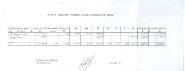 За цей період підприємством було виплачено Шпоруку готівки в сумі 91 тисяча 684 гривні. Оскільки Шпорук витрачав більше коштів, аніж йому видавалося з каси, то нині підприємство боргує ще передним станом на 01 грудня 2014 року 45 тисяч 65 гривень. «Існує підозра про злочинну змову директора підприємства Шпорука та головного бухгалтера Гриневич, про що свідчить можлива підробка відомостей у журналі-ордері № 3 «Підзвітні особи». Головний бухгалтер «Звірівського МГ» Тетяна Гриневич виконувала свої функції та функції касира. Не виключено, що вона й сама собі здійснювала доплату за лише ймовірне виконання інших функціональних обов’язків», – кажуть у Відділі протидії корупції Самооборони Волині.