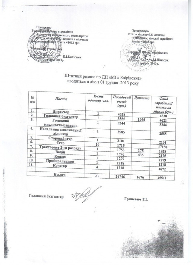 У штатному розписі підприємства керівництво Волинського управління лісового та мисливського господарства в особі екс-начальника Богдана Колісника, який затвердив фонд заробітної плати на суму 41 тисяча 12 гривень бюджетних коштів (це чітко вказано на документі вгорі). Натомість головний бухгалтер Тетяна Гриневич самовільно збільшила фонд заробітної плати до 45 тисяч 511 гривень. Чи це було відомо самому Коліснику, який підписав даний документ – невідомо?