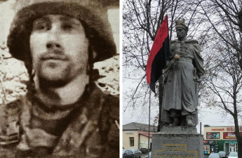 Червоно-чорне полотнище з написом "Віримо в ЗСУ" та підписами побратимів з 14-ї окремої механізованої бригади розмістив на пам'ятнику українському гетьману та полководцю Богданові Хмельницькому у центрі Рожища військовий Олександр Андрієвський з Рудні, який приїхав вперше за довгий час з передової у кількаденну відпустку.
