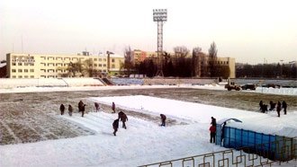 Працівники стадіону прибрали сніг із газону, нині триває вкладання нової спеціальної імпортної плівки, яка водночас захистить газон від перепаду температур і сприятиме розмерзанню ґрунту, що цього річ промерз на 20 сантиметрів.