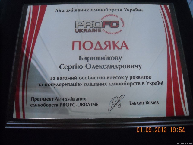 До слова, за вагомий особистий внесок у розвиток та популяризацію змішаних єдиноборств в Україні Ельхан Велієв вручив подяки організаторам заходу - Сергію Баришнікову та Сергію Верещаку.