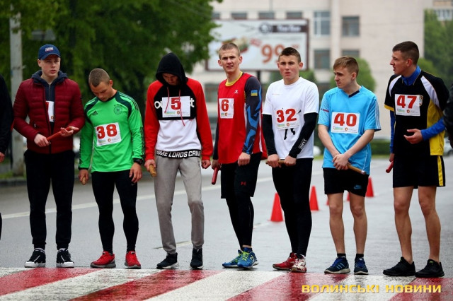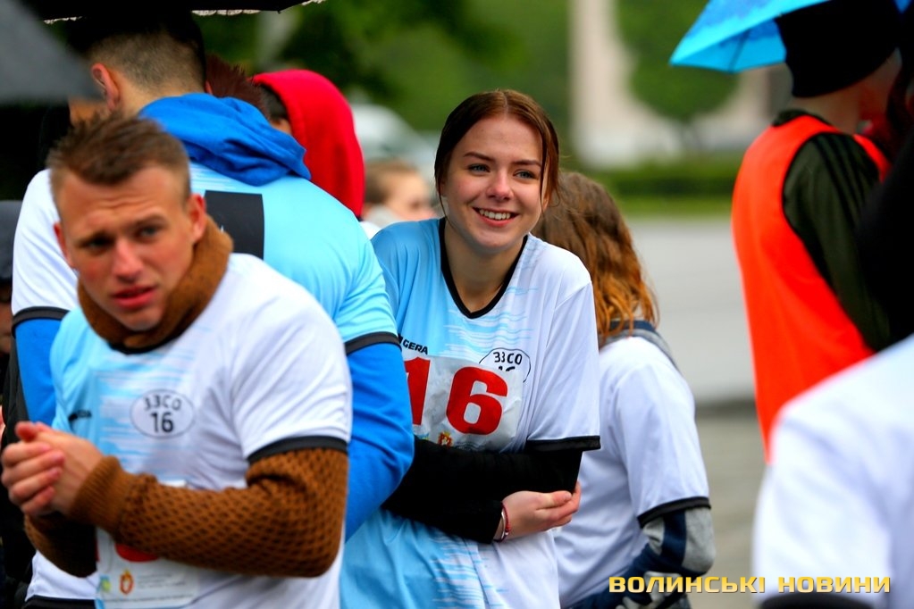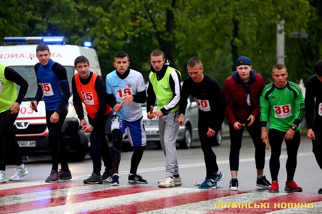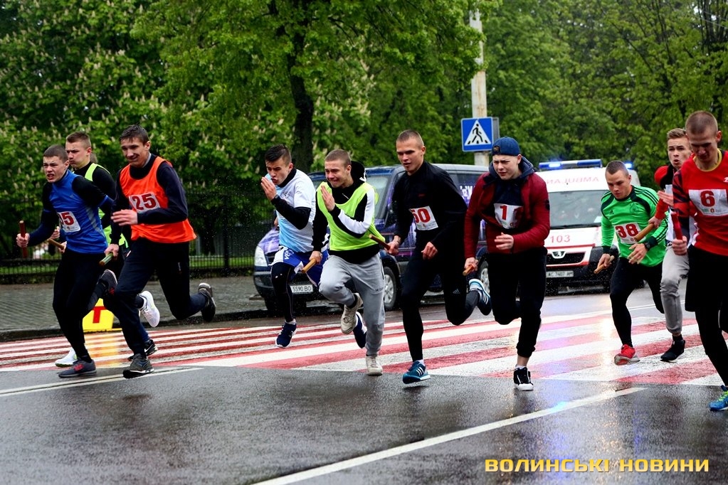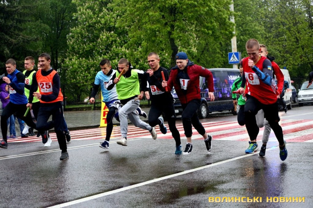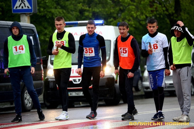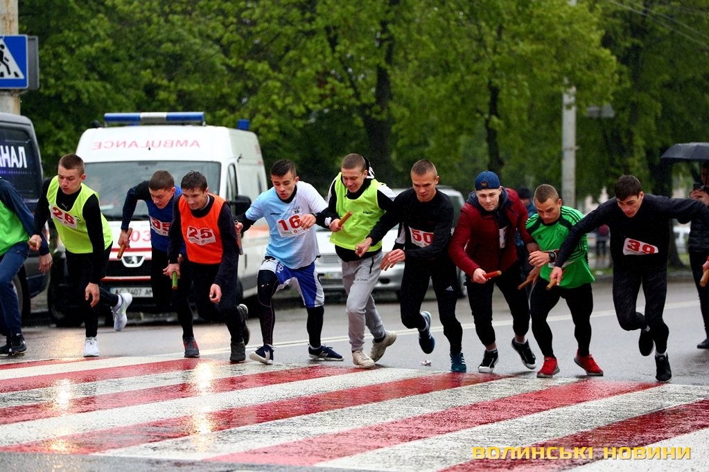 Незважаючи на рясний дощ, вже о десятій годині до місця старту почали сходитися учасники змагань, а тим часом поліції почала перекривати центральні вулиці міста. Організатори одразу ж повідомили, що учасники стартують при будь-якій погоді. Вони також звернули увагу учасників на небезпечність ділянки дистанції на вулиці Богдана Хмельницького, адже там прокладена бруківка, тож існував підвищений рівень травматизму.Учасник змагань Дмитро, який є студентом Луцького коледжу рекреаційних технологій і права, розповів, що не вперше приймає участь у цих змаганнях, тож настрій в нього бойовий. Жартома він зауважив, що в його команди не має суперників, тому вони сьогодні обов’язково виграють.Маршрут забігу пролягав проспектом Василя Мойсея (старт навпроти центрального входу до Меморіального комплексу «Вічна Слава») – вул. Винниченка – вул. Словацького – вул. Богдана Хмельницького – вул. Сенаторки Левчанівської – вул. Глушець – вул. Паркова – пр. Волі – вул. Шопена – пр. Василя Мойсея (фініш навпроти центрального входу до Меморіального комплексу «Вічна Слава»). Загальна дистанція естафети склала 4 тисячі 560 метрів. Зі слів організаторів, зазвичай таку дистанцію лідери пробігають за 11 хвилин, а всі команди вкладаються в 20 хв.У підсумку, третє місце здобула команда Луцького педагогічного коледжу, друге – команда Академії рекреаційних технологій та права. Ну а першою цьогоріч стала команда Східноєвропейського національного університету імені Лесі Українки, яка була переможцем першої групи минулого року.