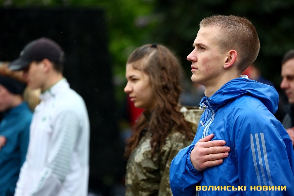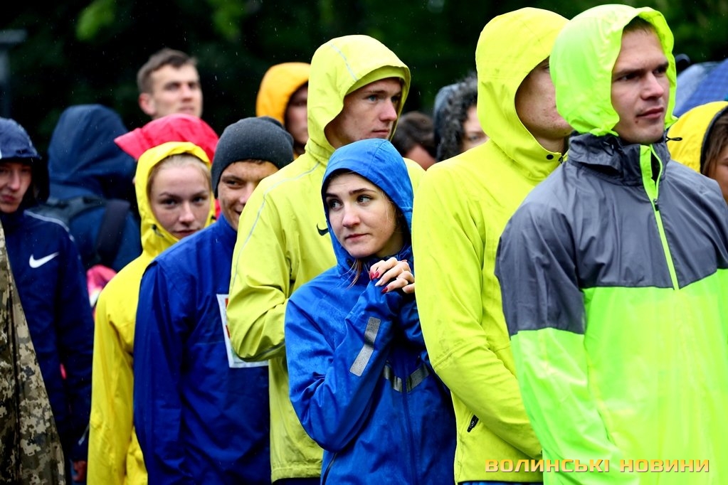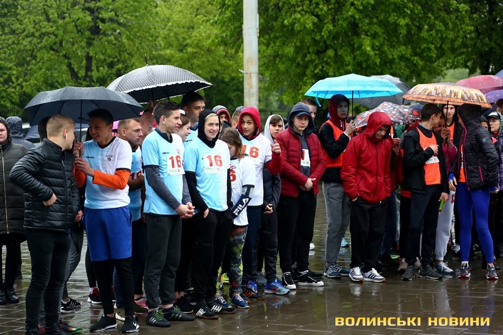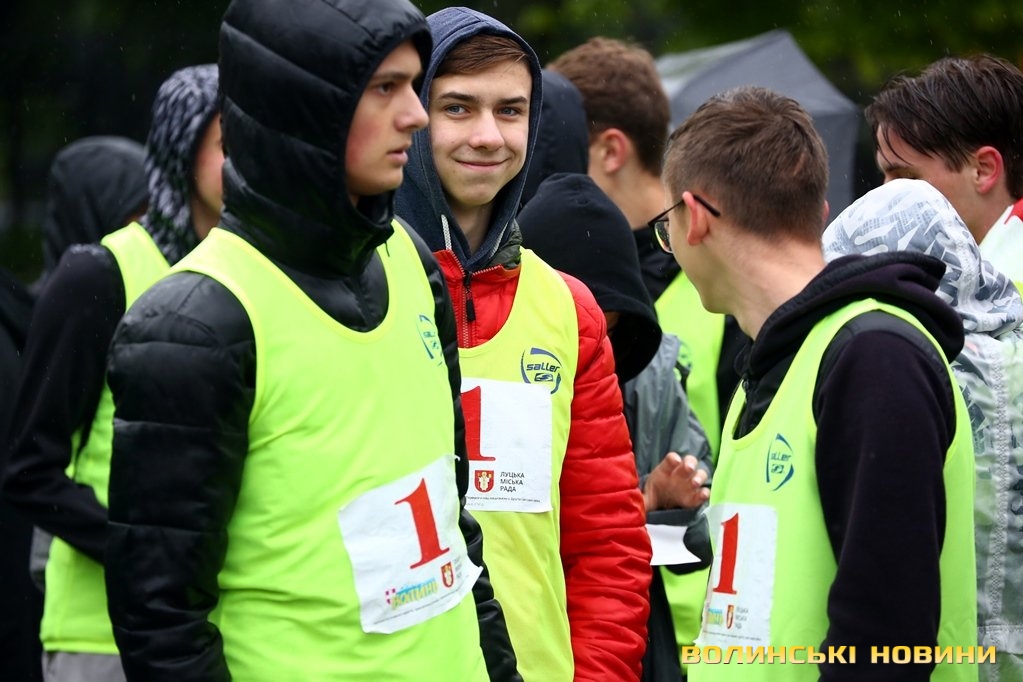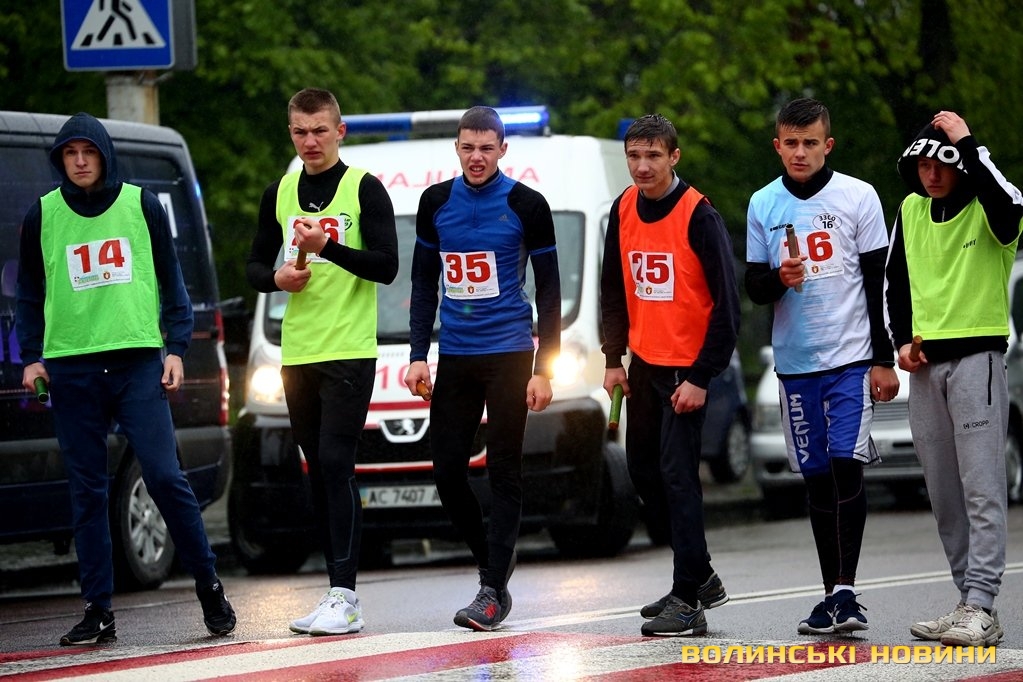 Незважаючи на рясний дощ, вже о десятій годині до місця старту почали сходитися учасники змагань, а тим часом поліції почала перекривати центральні вулиці міста. Організатори одразу ж повідомили, що учасники стартують при будь-якій погоді. Вони також звернули увагу учасників на небезпечність ділянки дистанції на вулиці Богдана Хмельницького, адже там прокладена бруківка, тож існував підвищений рівень травматизму.Учасник змагань Дмитро, який є студентом Луцького коледжу рекреаційних технологій і права, розповів, що не вперше приймає участь у цих змаганнях, тож настрій в нього бойовий. Жартома він зауважив, що в його команди не має суперників, тому вони сьогодні обов’язково виграють.Маршрут забігу пролягав проспектом Василя Мойсея (старт навпроти центрального входу до Меморіального комплексу «Вічна Слава») – вул. Винниченка – вул. Словацького – вул. Богдана Хмельницького – вул. Сенаторки Левчанівської – вул. Глушець – вул. Паркова – пр. Волі – вул. Шопена – пр. Василя Мойсея (фініш навпроти центрального входу до Меморіального комплексу «Вічна Слава»). Загальна дистанція естафети склала 4 тисячі 560 метрів. Зі слів організаторів, зазвичай таку дистанцію лідери пробігають за 11 хвилин, а всі команди вкладаються в 20 хв.У підсумку, третє місце здобула команда Луцького педагогічного коледжу, друге – команда Академії рекреаційних технологій та права. Ну а першою цьогоріч стала команда Східноєвропейського національного університету імені Лесі Українки, яка була переможцем першої групи минулого року.