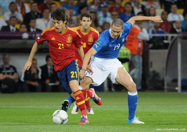 Бо іспанці розпочали матч надупевнено, з тотальним контролем м'яча, і вже на 14-й хвилині відкрили рахунок. Італійці відразу включили пресинг, але в атаці у команди гра не клеїлась. Балотеллі, у порівнянні з грою проти німців просто стояв, а Кассано вистачило лише на декілька ударів з далекої відстані. Іспанці, у свою чергу, продовжували тішити око своїми комбінаціями, одна з яких під завісу першого тайму завершилася класним пасом Іньєсти і м'ячем Хорді Альби.