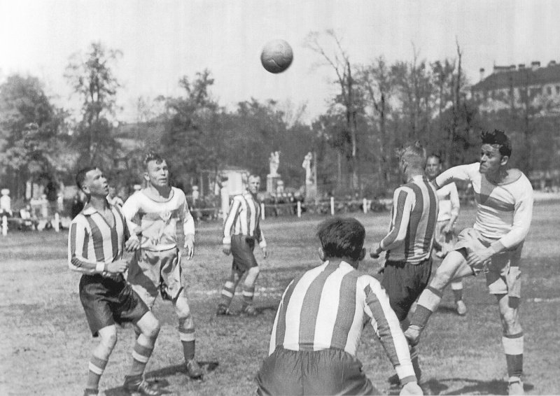 «В 5 годин 20 хвилин суддя Мосгард сповістив про початок матчу. Дві команди: «Спартак» - в червоних майках, «Динамо» - в білих з блакитною полоскою. Коротке привітання «фізкульт-ура» і футболісти розбіглися по своїх місцях. Матч почався. Швидка пасовка, м’яч перелітає з одного краю на другий.