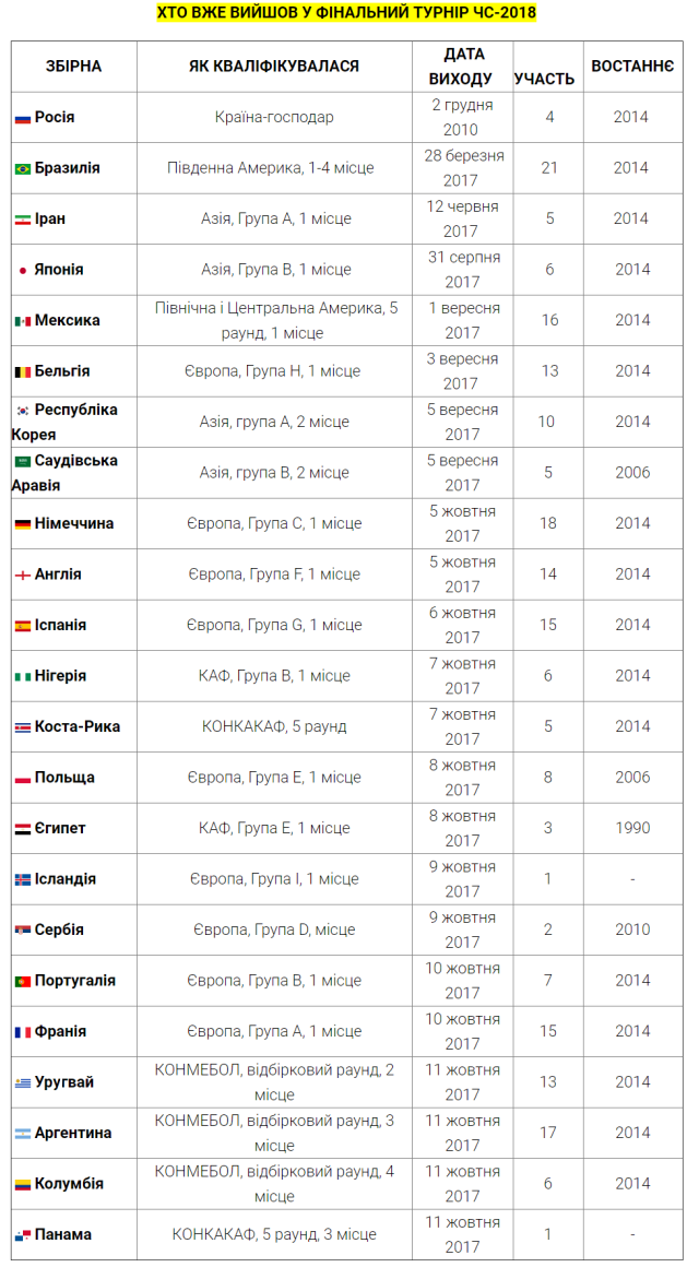 У табличці наведені команди, які вже вийшли у фінальний турнір ЧС-2018.