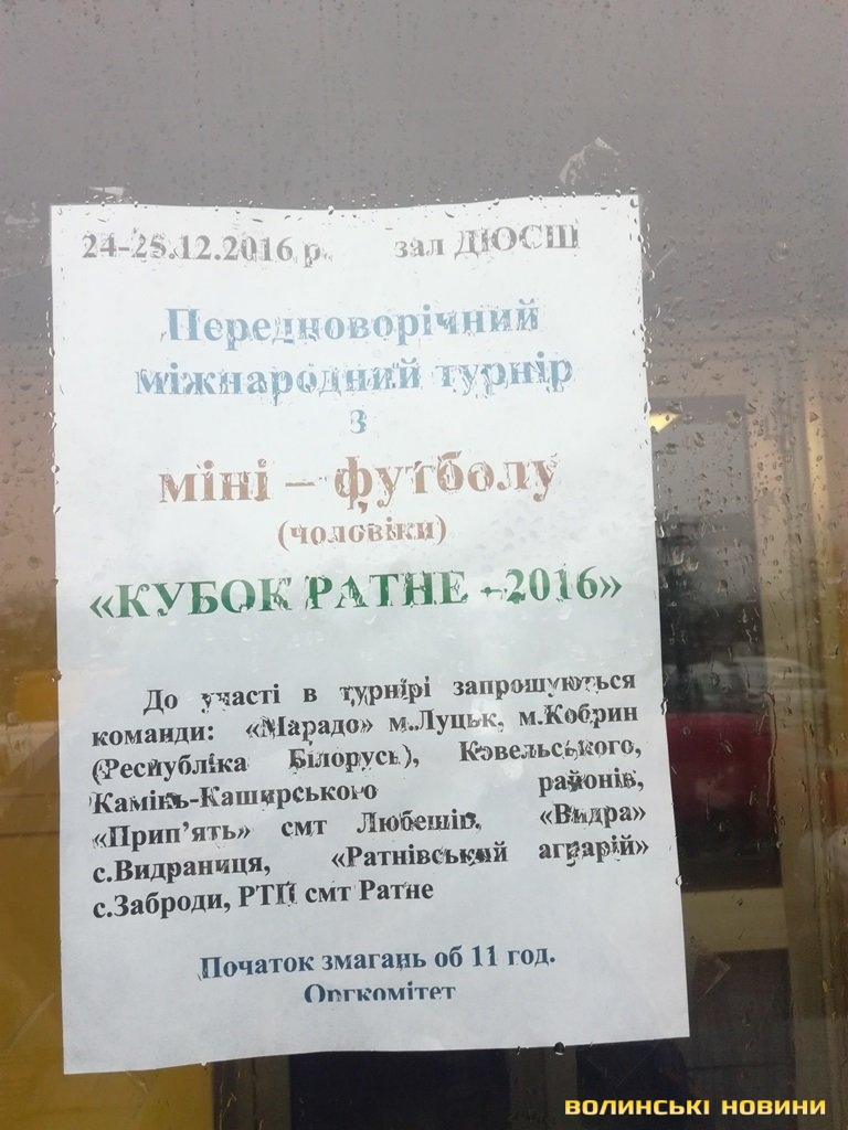 Турнір з міні-футболу відбувся 24-25 грудня в смт Ратне. Загалом участь в змаганнях взяли сім команд, які прибули з Луцька (команда «Марадо»), Старовижівського та Камінь-Каширського району, смт Любешова («Прип’ять»), села Видраниці («Видра»). Господарі турніру були представлені двома колективами («Ратнівський аграрій» та РТП «Ратне»). Також організатори змагань очікували на прибуття команди з міста Кобрина (Білорусь), однак через певні причини білоруси не приїхали до Ратного.