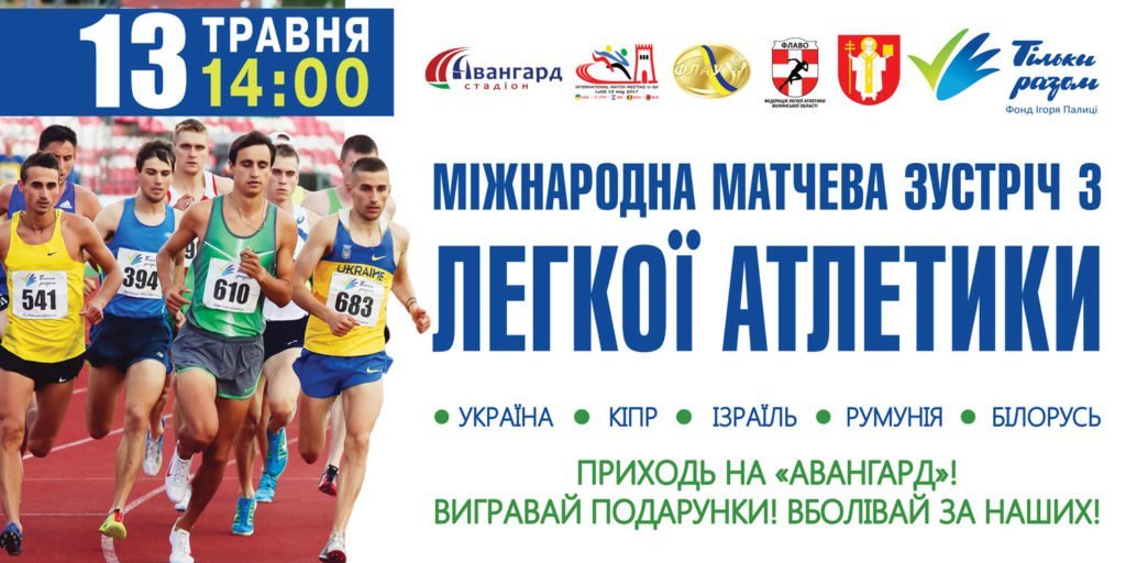 Представницькі міжнародні легкоатлетичні змагання відбудуться у Луцьку. Стадіон «Авангард», головна спортивна арена Волині, 13 травня прийме Міжнародну матчеву легкоатлетичну зустріч U-20 Україна-Кіпр-Ізраїль-Румунія-Білорусь.