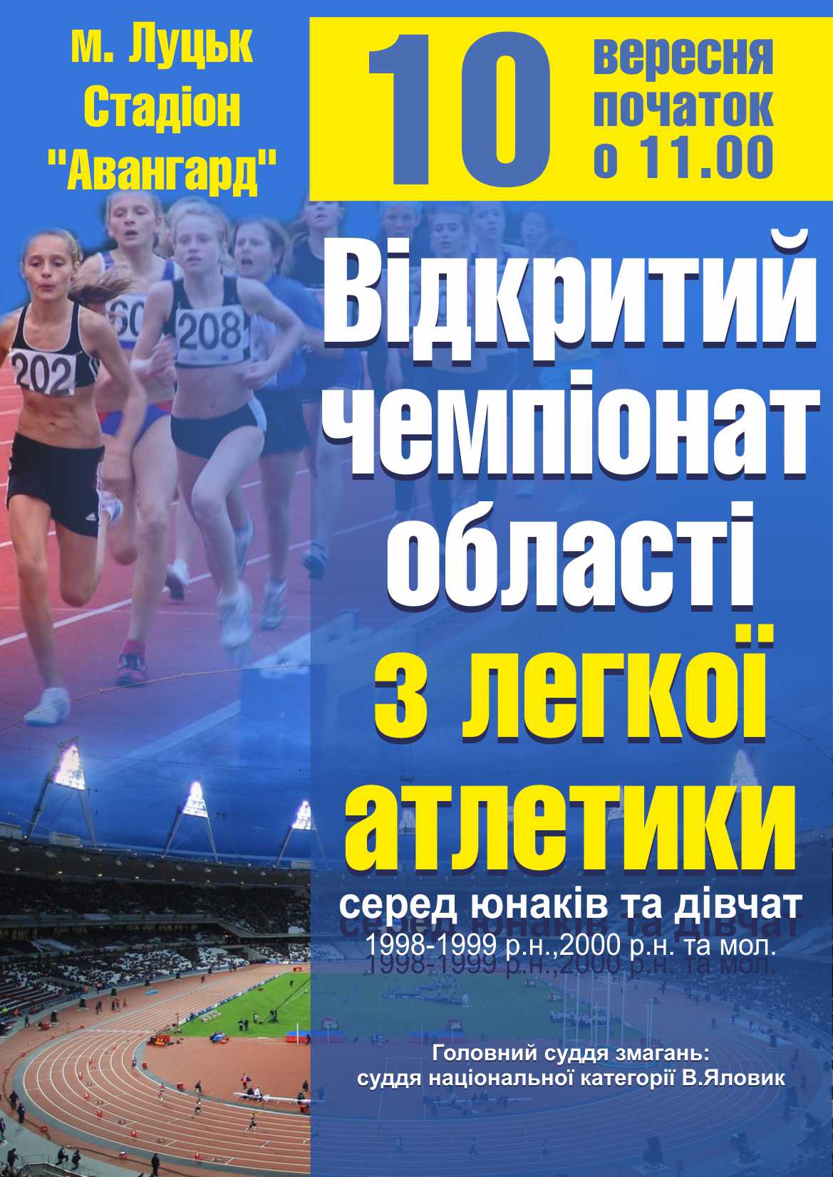 На оновленому стадіоні «Авангард» у Луцьку відбудеться відкритий чемпіонат Волинської області з легкої атлетики серед юнаків та дівчат 1998-1999 років народження та молодших.