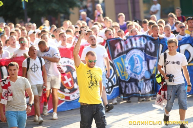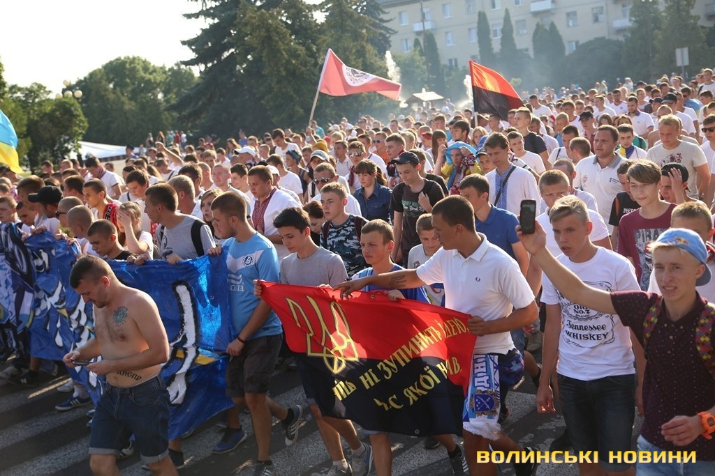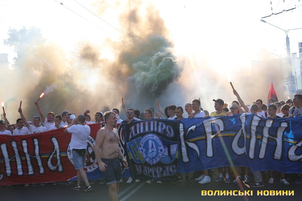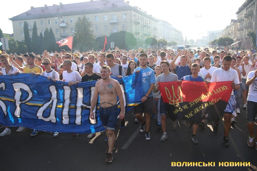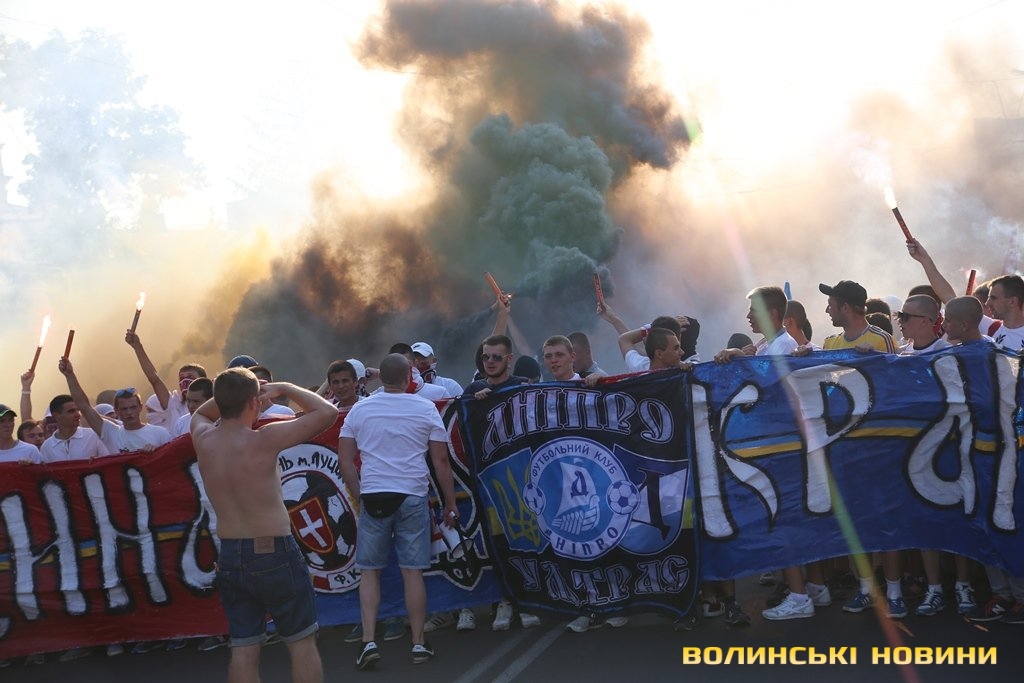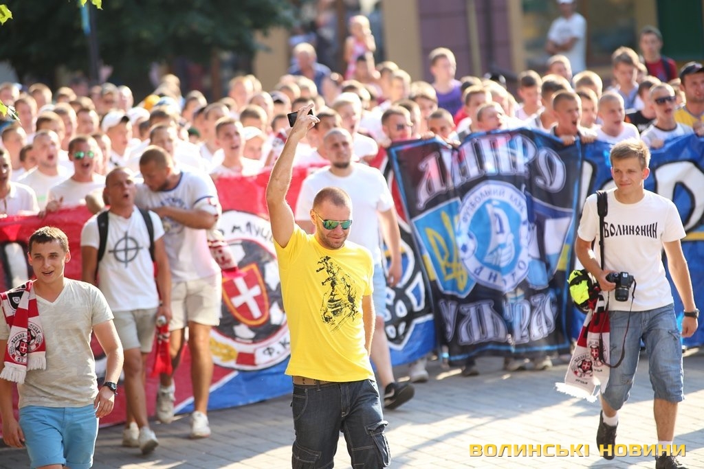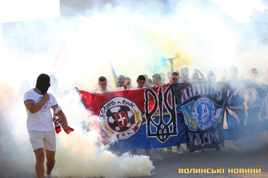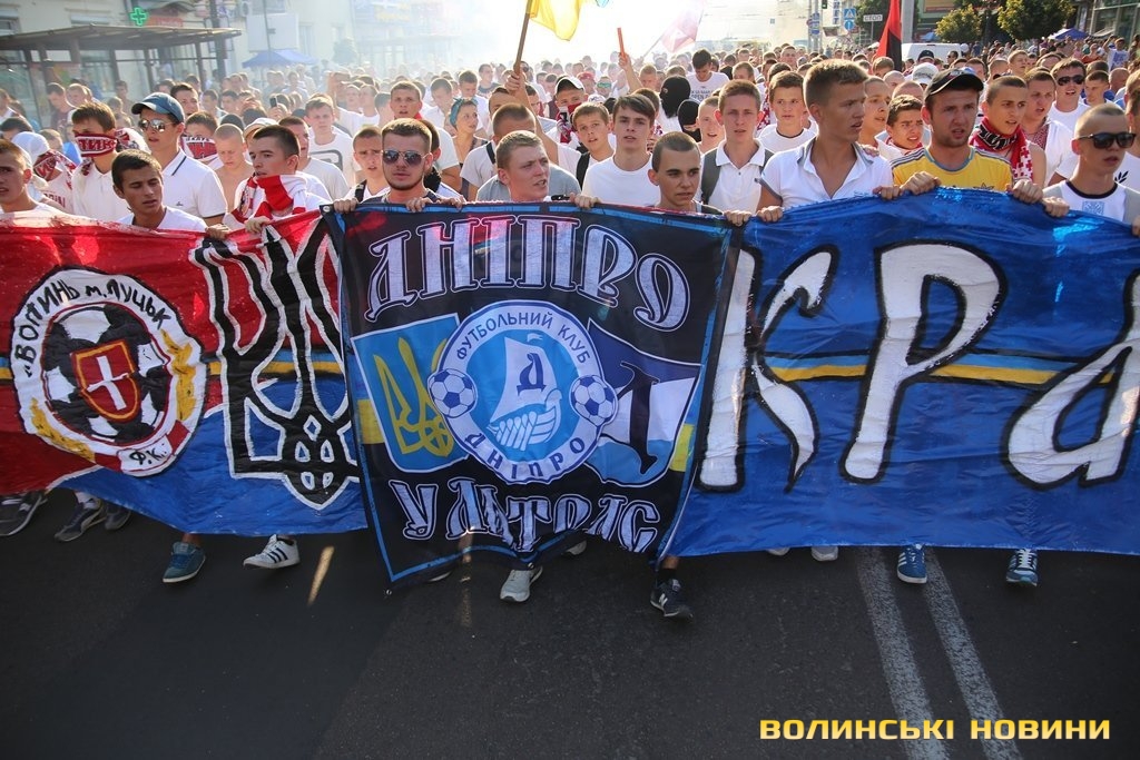 Пліч-о-пліч фанати «Волині» та «Дніпра» пройшли вулицями Луцька у рамках маршу перед грою футбольних команд. Під час дійства звучали заклики до єдності Сходу та Заходу України, а також пісні, в яких молодики висловлювали своє ставлення до Президента РФ Володимира Путіна.