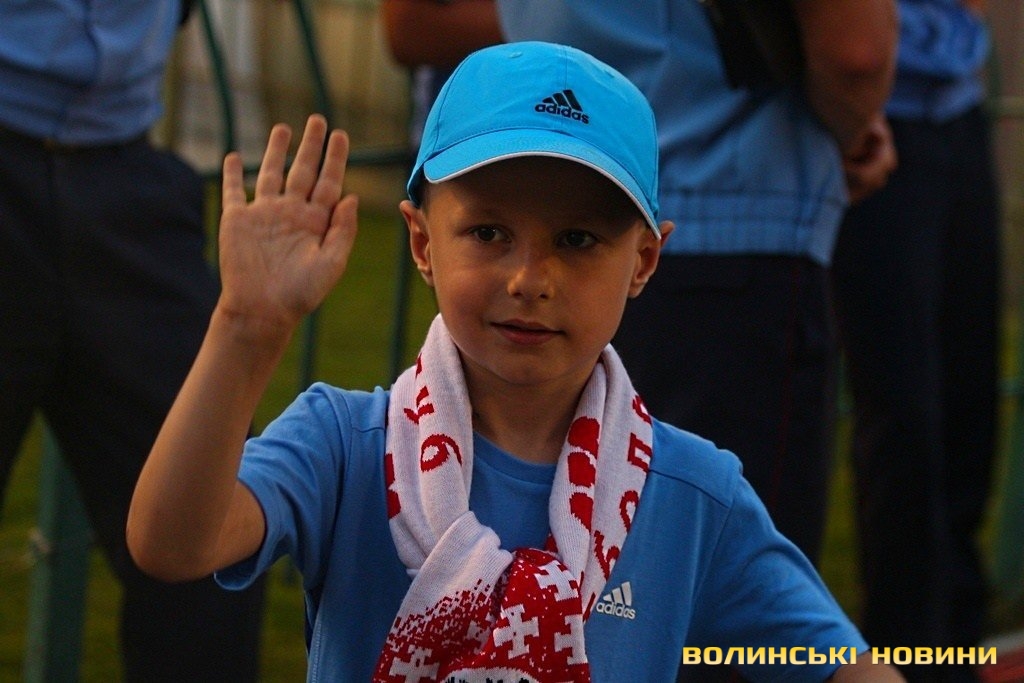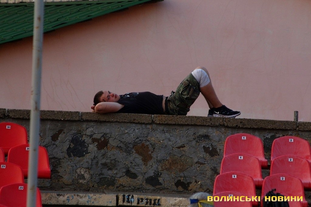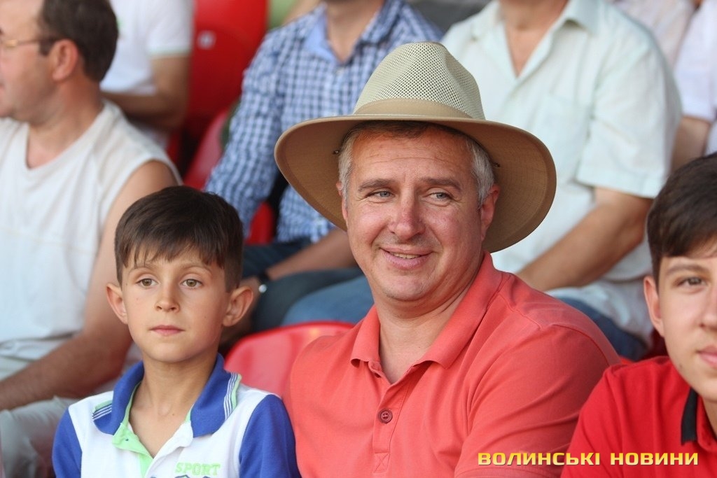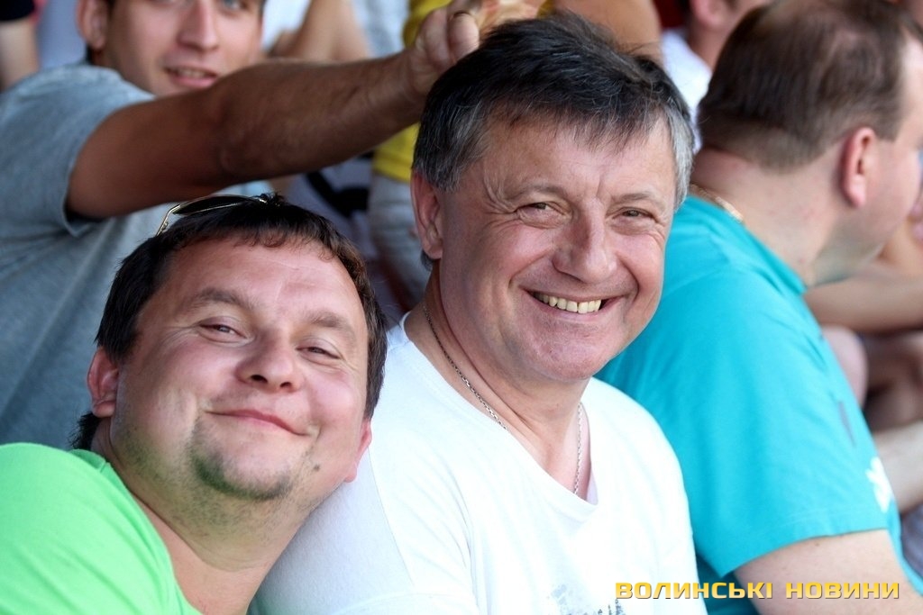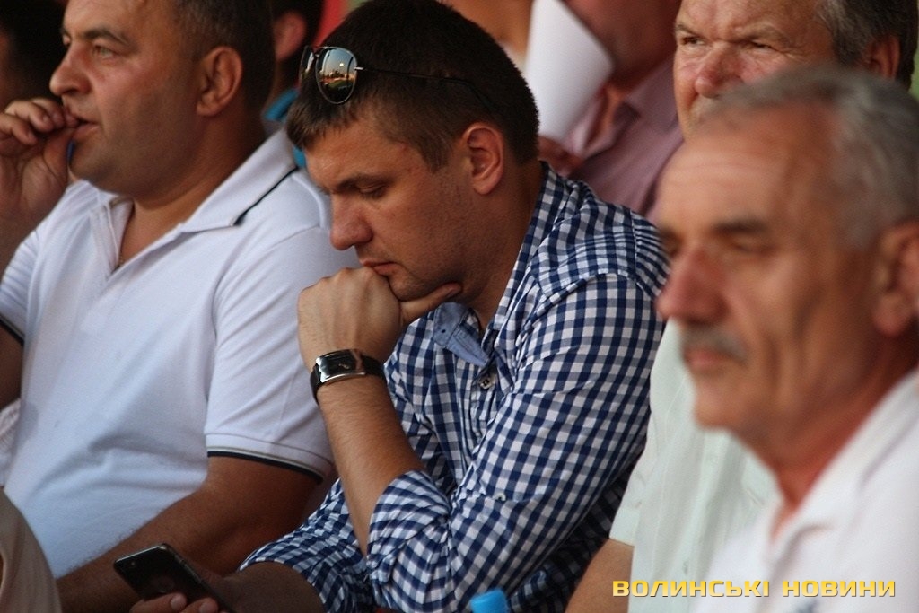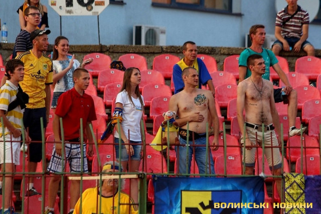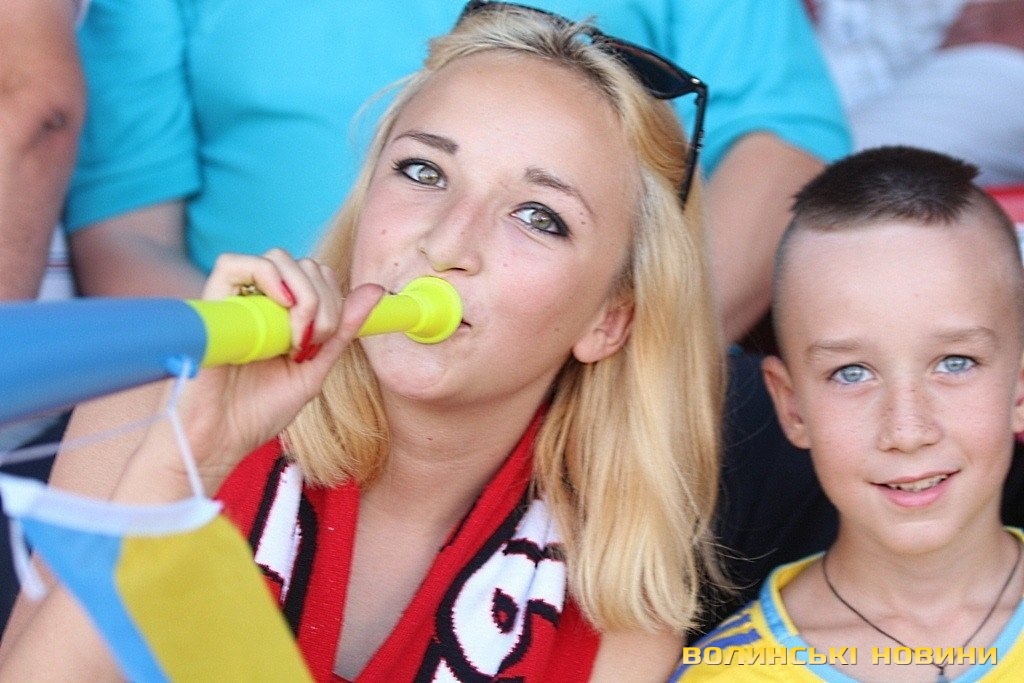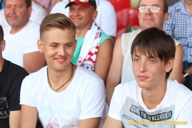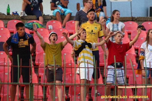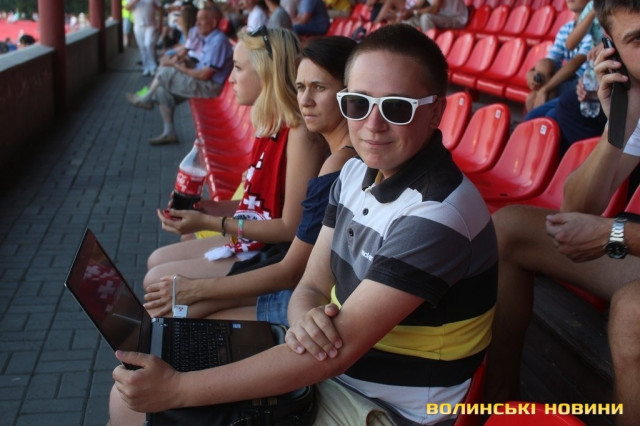Як і завше, у будь-яку пору року та погодні умови, навіть у 35-градусну спеку, вірні улюбленій команді ультрас із фан-сектору прийшли підтримати своїх «хрестоносців». Такий стан речей уже давно став приємною «константою».По протилежну сторону стадіону за своїх гравців вболівали фани команди-супротивникаНе обійшлось й без відомих людей обласного центру. Ось депутат Луцької міськради Богдан Шиба дружньо обговорює подробиці матчу із очільником Луцьких міліціянтів Ігорем Муковозом.Як завжди, нерозлучний із власним телефоном, одним оком на футбольне поле поглядає нардеп Ігор ГузьВеликою приємністю є й те, що мами й татусі, а також бабусі й дідусі змалку прищеплюють любов до спорту своїм маленьким друзям. Тому щоразу на стільцях вболівальників й не тільки можна побачити представників майбутнього покління різного віку.Однак, навіть найпалкіші уболівальники не в силах встоятти перед палючим сонцемА тим часом спортивні журналісти пильно слідкують за ходом подій на поліФото Вікторії СЕМЕНЮК