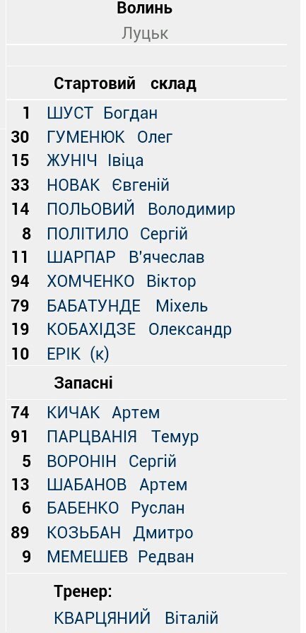 Cклад «Волині» під час сьогоднішньої гри: