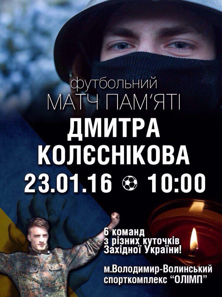 6 футбольних команд з різних куточків Західної України, мешканці міста, побратими, друзі та родина зустрінуться у Володимирі-Волинському, у спорткомплексі “Олімп”, щоб вшанувати пам’ять бійця 1-ї штурмової роти 5-го окремого батальйону Добровольчого українського корпусу, захисника Донецького, уродженця Володимира-Волинського Дмитра Колєснікова. Захід запланований на 23 січня, суботу, о 10:00 ранку. Про це повідомляють на сторінці Типовий Володимир.