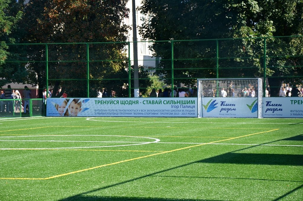 Такі поля у рамках проекту «Футбольне поле в кожну луцьку школу» мають бути у всіх навчальних закладах. Загалом на спортивну інфраструктуру міста та області витрачено понад 72 мільйона власних коштів Ігоря Палиці.