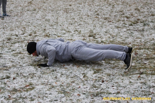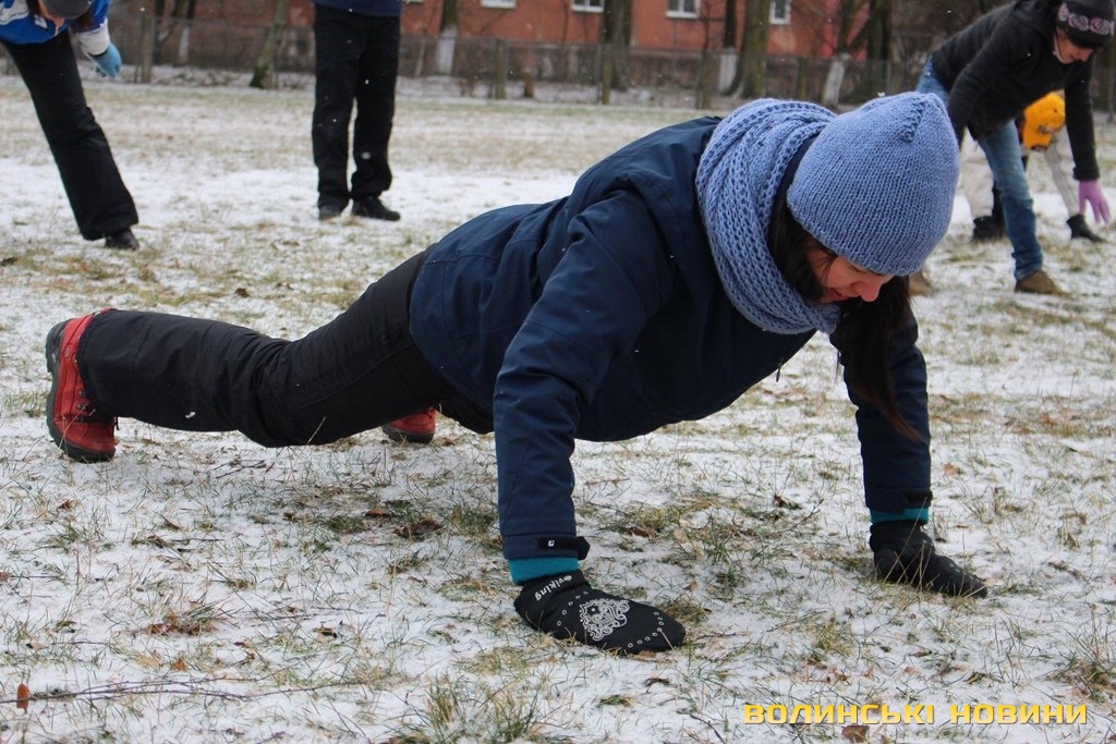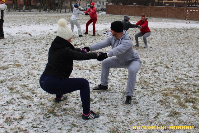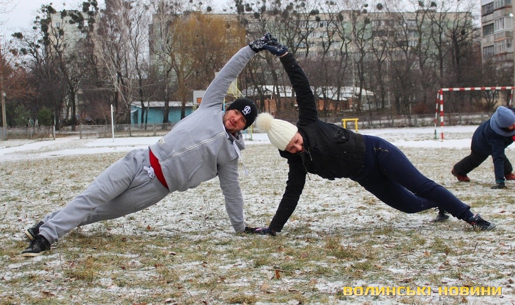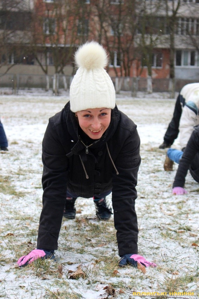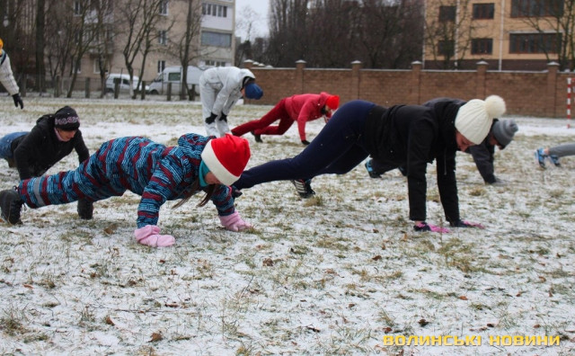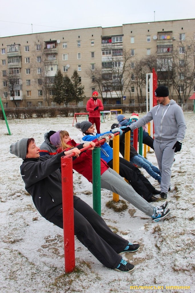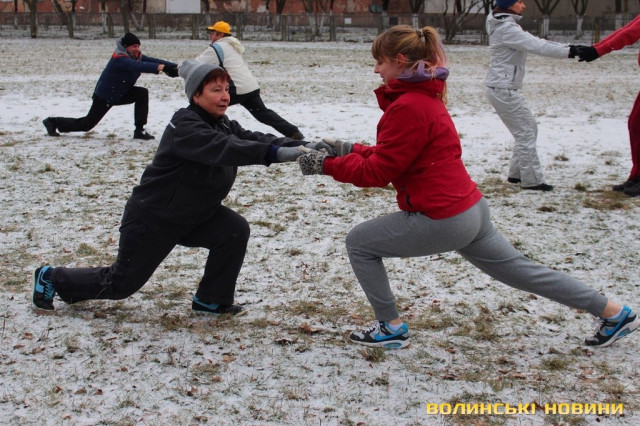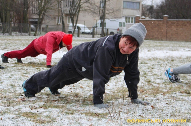 Розпочавши тренування бігом, учасники перейшли до вправ, серед яких, до речі, було багато силових та статичних: «ведмежа хода», планки, випади, присідання… Загалом робили усе можливе, щоб «струсити» тортики, салатики, кутю.