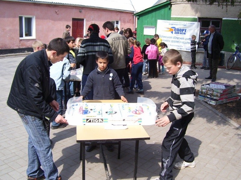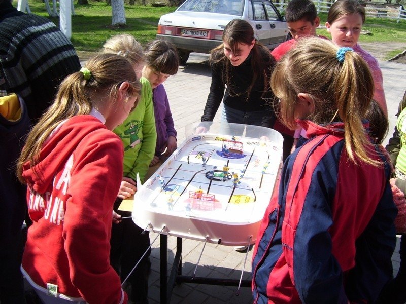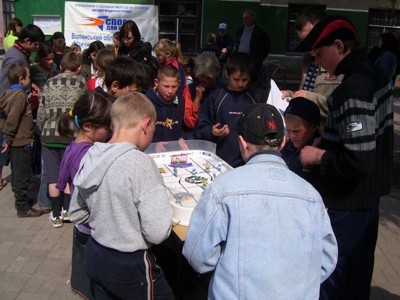 Захоплюючий чемпіонат провели волонтери обласного центру фізичного здоров’я населення «Спорт для всіх». Просто неба на майданчику перед школою для дітей облаштували кілька «льодових стадіонів». Учасники попарно і наодинці керували механічними хокеїстами, виборюючи кубок і медалі змагань.