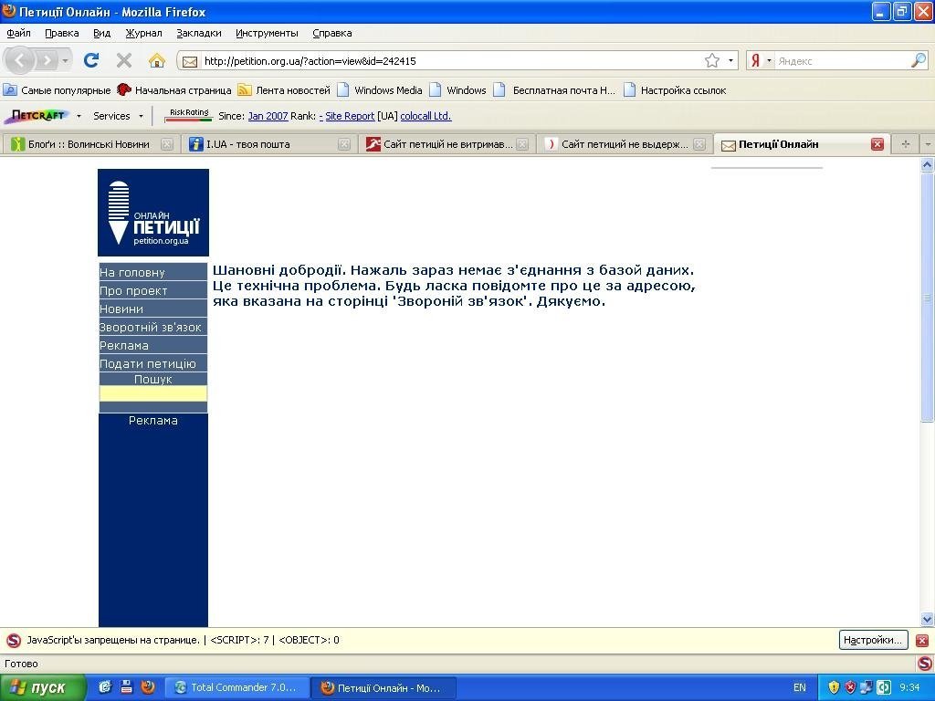 На ранок понеділка сайт не працював. У вівторок 1 грудня о 09:30 відвідувачі сайту, що відвідали сторінку http://petition.org.ua/?action=view&id=242415, замість петиції прочитали текст: «Шановні добродії. Нажаль зараз немає з\'єднання з базою даних. Це технічна проблема. Будь ласка повідомте про це за адресою, яка вказана на сторінці \'Звороній зв\'язок\'. Дякуємо».