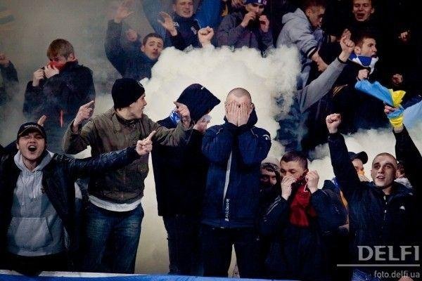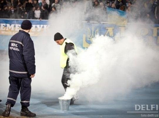 Уболівальники 29 березня вели більш, ніж розкуто. Спочатку один влаштував пожежу на трибуні. Зрештою, з палаючим прапором він зістрибнув з трибуни і рушив у бік поля.