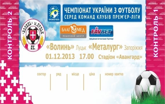 Квитки на заключний у 2013 році матч чемпіонату України «Волинь» – «Металург» (Запоріжжя), який відбудеться в неділю, 1 грудня, о 17.00, продаватимуться у касах стадіону «Авангард» з п’ятниці, з 10.00, - повідомляє клубна прес-служба.