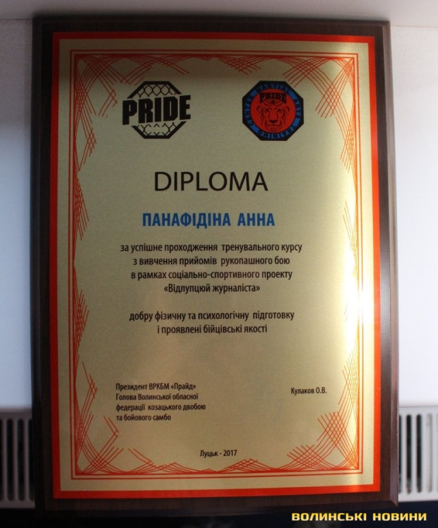 «Вдало склавши іспит із самозахисту та попрощавшись із 6 кг зайвої ваги Анна довела усім дівчатам, що досягти можна будь-яких результатів, головне – бажання»,- розповідає організатор заходу, тренер журналістів Олександр Кулаков.