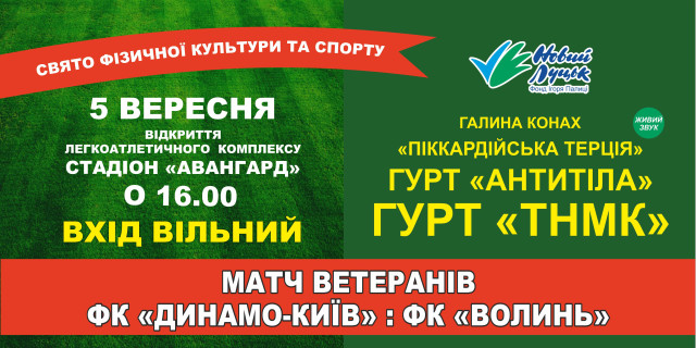 Лучан та гостей міста запрошують на свято фізичної культури та спорту, яке відбудеться 5 вересня на стадіоні «Авангард». Зауважимо, тут закінчився один з етапів його реконструкції.