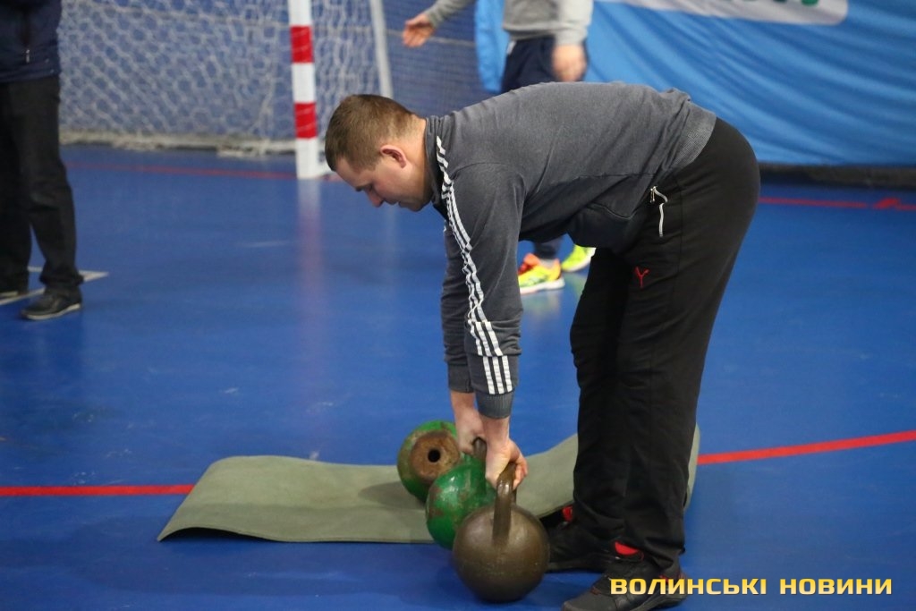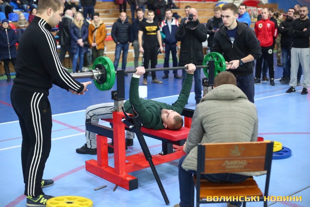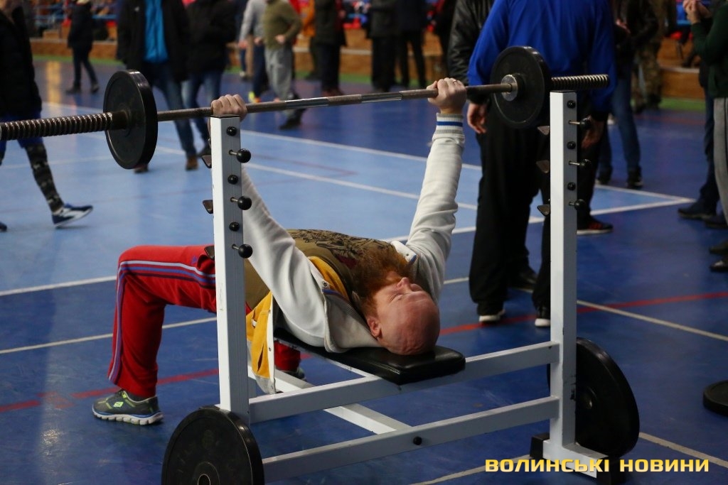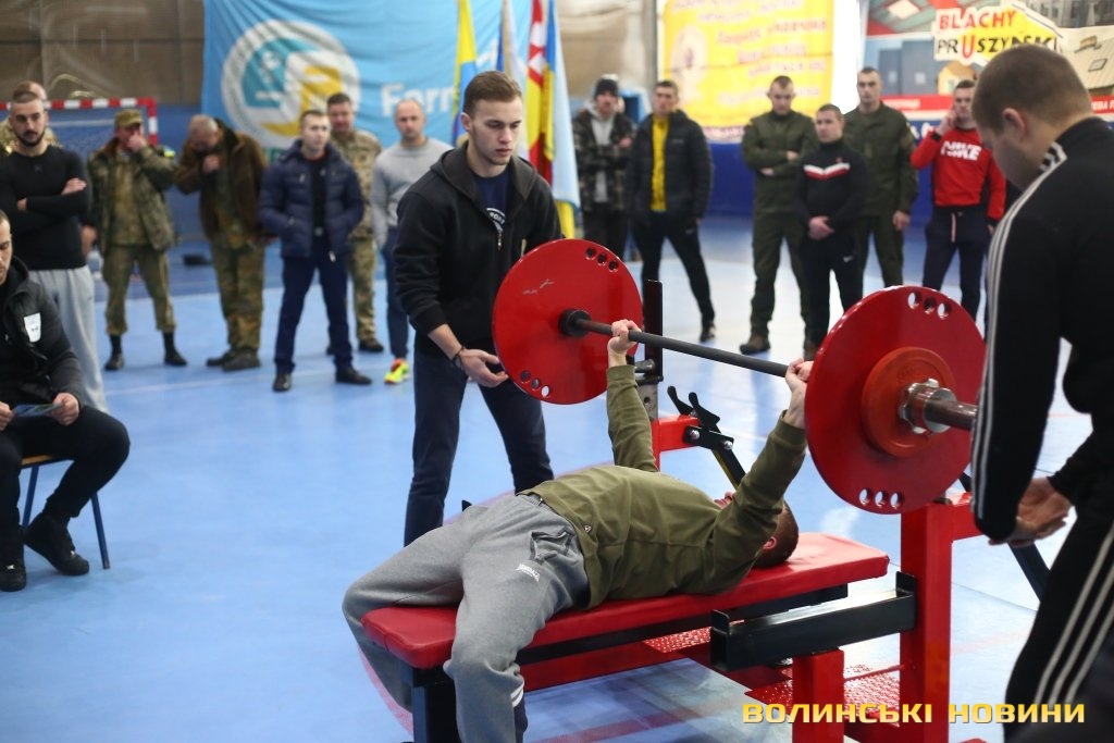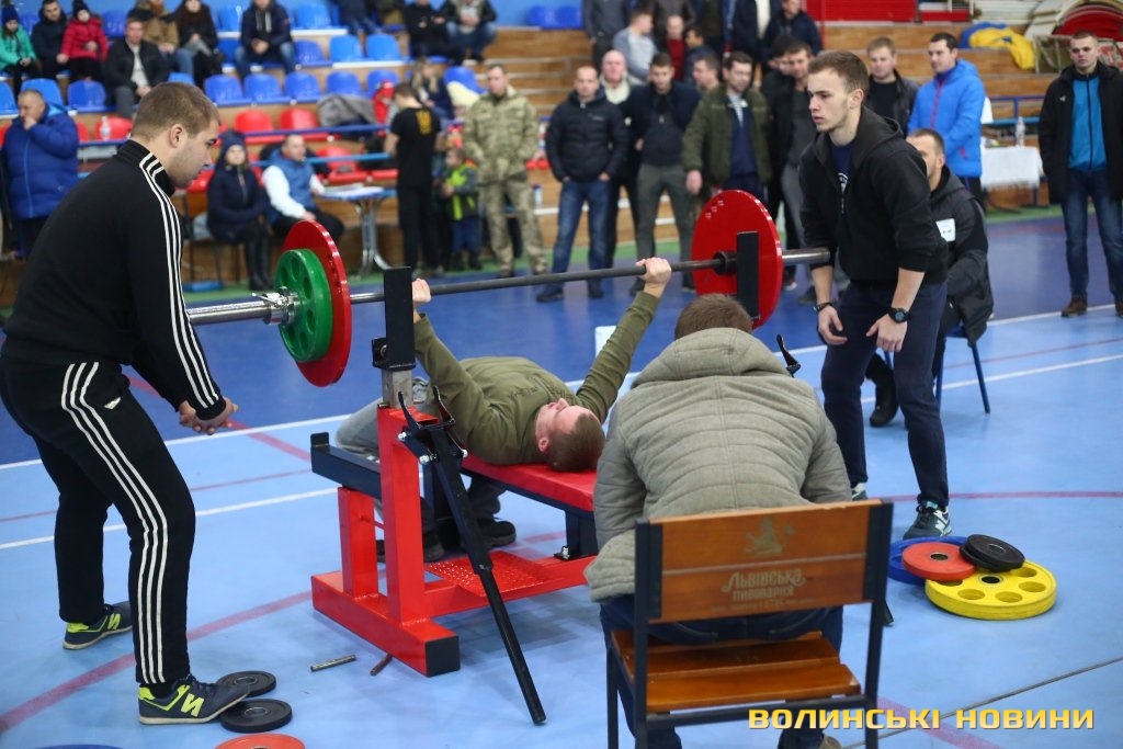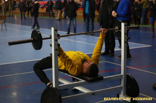 Військові та ветерани АТО змагаються в армреслінгу, пауерліфтингу та гирьового спорту під час турніру «Сталева воля» пам'яті Олега Твердохліба (бійця батальйону «Айдар», попереднього Голови громадської спілки «Спілка воїнів АТО Волині»).