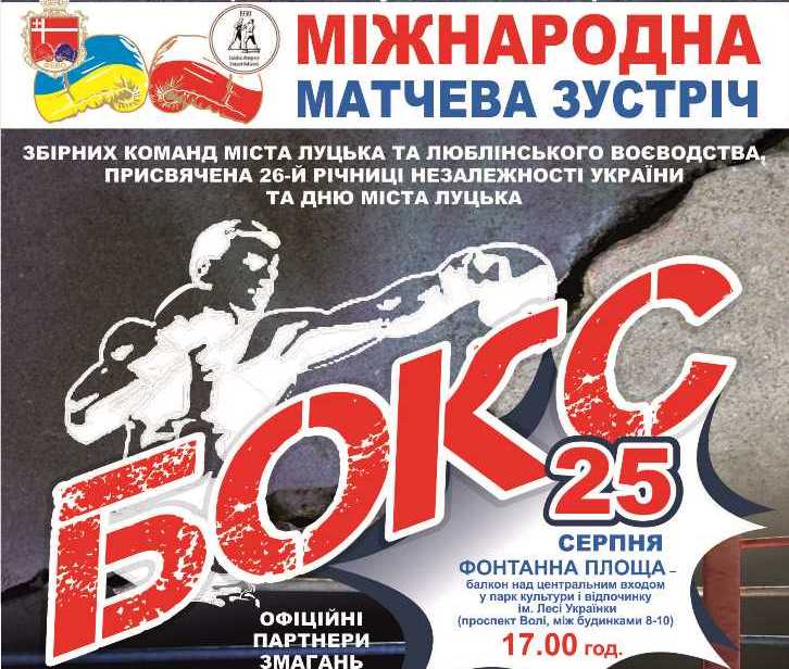 Міжнародна матчева зустріч з боксу серед збірних команд міста Луцька та Люблінського Воєводства, присвячена 26-ій річниці Незалежності України та Дню міста Луцьк, відбудеться 25 серпня. Дійство проходитиме на фонтанній площі Луцька – балконі над центральним входом у Парк культури і відпочинку ім. Лесі Українки, повідомляє прес-служба Фонду Ігоря Палиці "Тільки Разом".