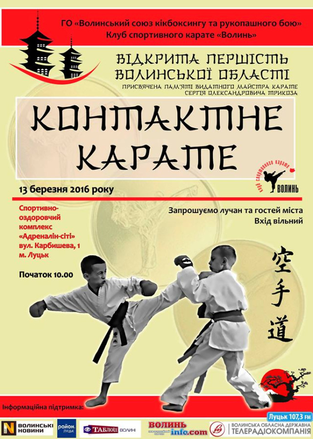 У Луцьку відбудеться дитячо-юнацька Відкрита першість Волинської області з контактного карате, присвячена пам’яті видатного майстра карате, тренера Трикоза Сергія Олександровича.