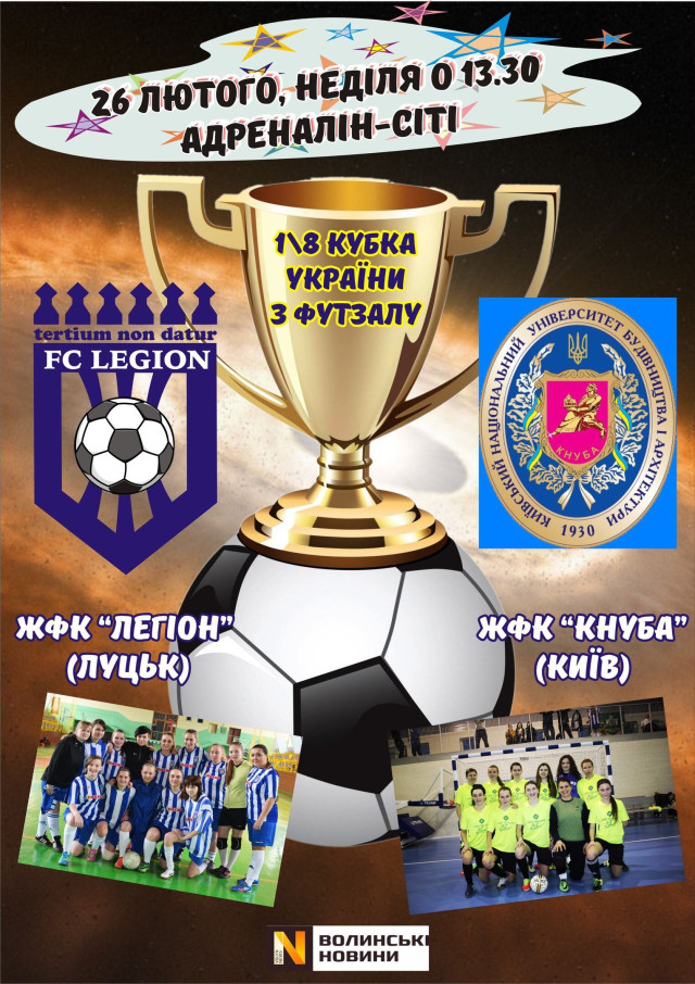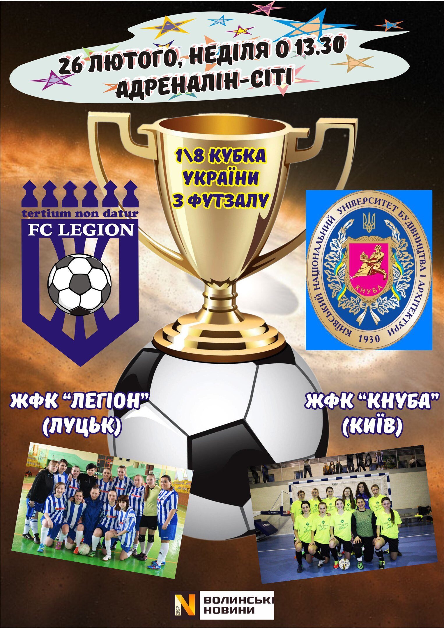 Цієї неділі у Луцьку дівчата зіграють 1/8 Кубка України з футзалу. ЖФК «Легіон» (Луцьк) змагатимуться із ЖФК «Кнуба» (Київ).