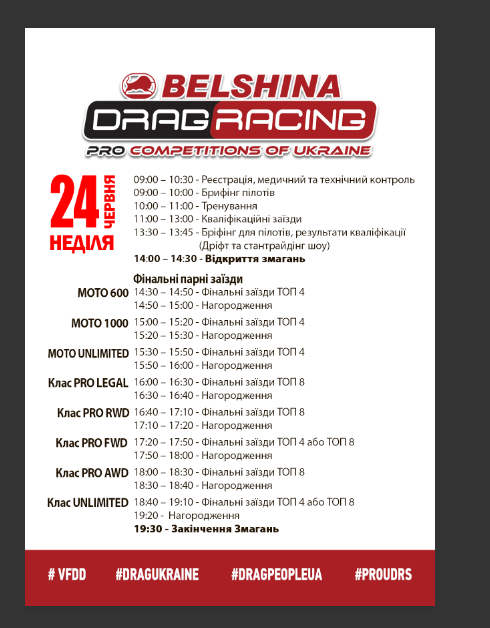 Наряду з неймовірними стартами дрегстерів, прогрівом гуми, запеклою боротьбою глядачів чекає дріфт- та стантрайдинг-шоу. І це буде ще одна незабутня шоу-програма для фанатів автоспорту.
