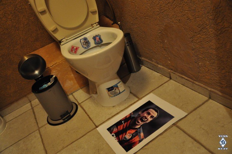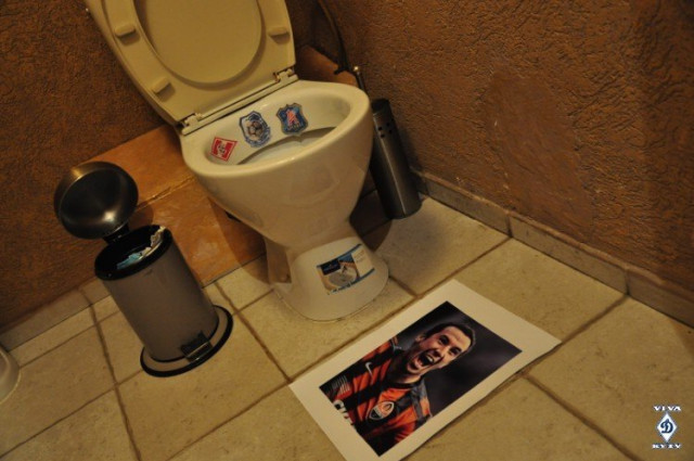 Найбільшу увагу привертає туалетна кімната. Внутрішню поверхню унітазу обклеїли емблемами ненависних клубів, а на підлогу перед унітазом кинули фотографію капітана "Шахтаря" Даріо Срни.