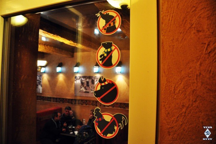 На скляних дверях пабу красується заборона на його відвідини "кротам", "тхорам", "свиням" і "півням". Тварини - у шарфах кольорів "Шахтаря", "Металіста", "Спартака" і київського "Арсеналу". А для тих, хто не зрозуміє, є роз'яснення в меню закладу: "Виключно для вболівальників "Динамо" Київ. Увага! Вхід з тваринами заборонено".
