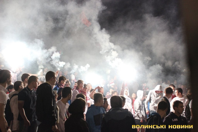 Так, фанати перегукувалися: «Харків» - «Луцьк». Було чути скандування: «Слава Україні», «Небесній сотні слава», «Герої не вмирають». Не шанували вболівальники і президента Росії Володимира Путіна, виспівуючи "Путін - х***о".