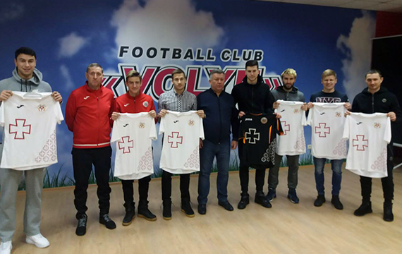 На фото (зліва направо): Валерій Болденков, головний тренер ФК «Волинь» Віктор Богатир, Олександр Климець, Олексій Клак, спортивний директор клубу Валентин Кошельник, Олександр Воробей, Рудольф Сухомлинов, Вадим Страшкевич, Роман Світличний.