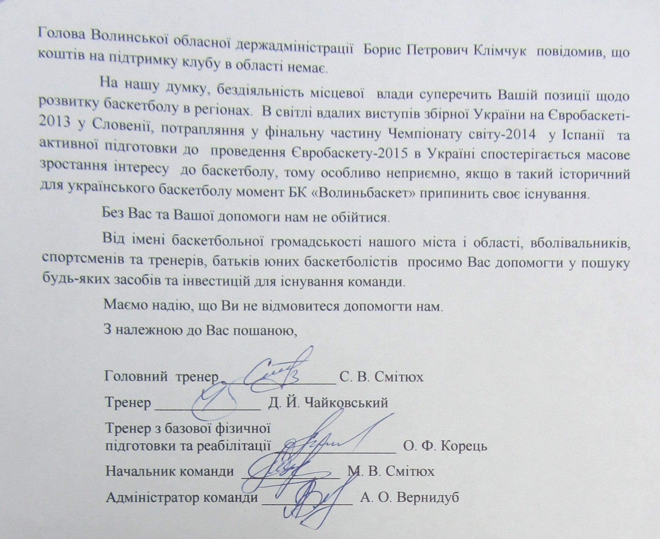 Керівництво команди «Волиньбаскет» не втрачає надію на порятунок команди і вдалося до відчайдушного кроку – відкритого листа Президентові України. Можливо після нього в команди таки з’являться прихильники, котрі захочуть і зможуть підтримати клуб і весь волинський баскетбол.