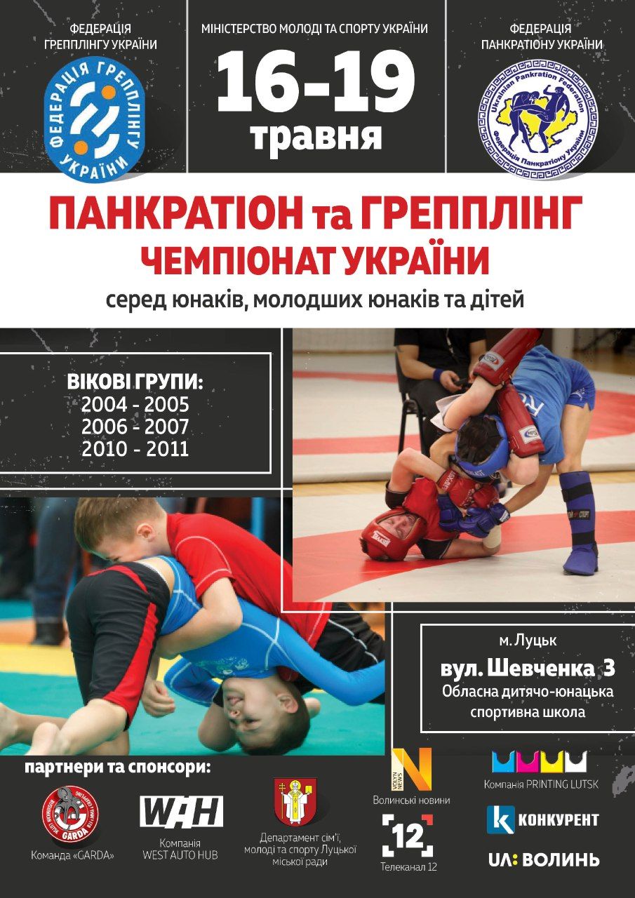 Чемпіонат України з панкратіону та грепплiнгу серед юнаків, молодших юнаків та дітей (2004-2005, 2006-2007 та 2010-2011 років народження) відбудеться у Луцьку з 16 до 19 травня.