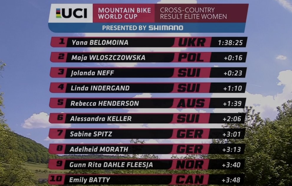 Українка Яна Беломоїна виграла другий етап Кубка світу в дисципліні маунтинбайк крос-кантрі, який відбувся у німецькому Альбштадті. Дівчата стартували в 11:15 за місцевим часом, повідомляє Xsport.