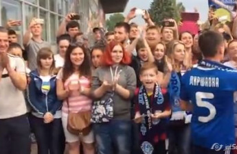 Сотні фанатів у Дніпропетровську зійшлися до аеропорту, щоб подякувати команді за яскравий сезон. Футболістів "Дніпра" вітали вигуками "Молодці!"
