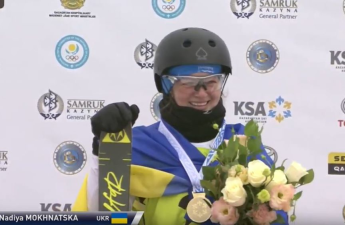 Українська фристайлістка Надія Мохнацька здобуває перемогу у змаганнях з лижної акробатики на етапі Кубку світу з фристайлу у Нур-Султані (Казахстан).