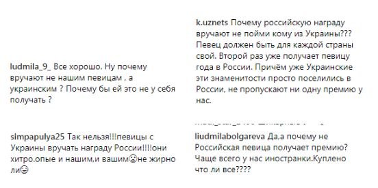 "Так не можна! Співачці з України вручати нагороду Росії! Вони хитро*опі: і нашим, і вашим. Чи не жирно?" - пишуть коментатори.