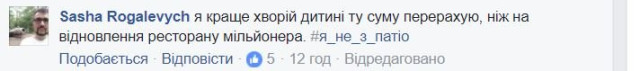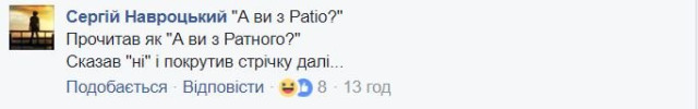 До Тараса Яковлева уже приєдналися екс-радник міського голови Богдан Гончарук, член «Самооборони Волині», підприємець Олександр Ніколайчук, обіцяли долучитися низка чиновників, піарників, медійників та бізнесменів.Тим часом громадський діяч Ілля Токаренко написав:Згодом ще й додав фото з пропозицією збирати кошти «йому на море».Думки коментаторів у соцмережі розділилися. До прикладу, коментарі в одній з найбільших Facebook-груп міста «Наш Луцьк»:Окрім того, пропонують альтернативний флешмоб та використовують хештег я_не_з_патіо.Нагадаємо, 26 липня у ресторані була пожежа. Власники зазнали збитків, проте комплекс виявився застрахованим.