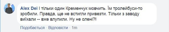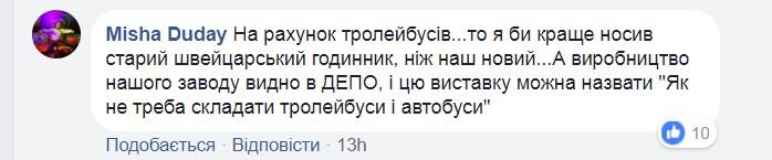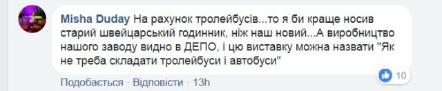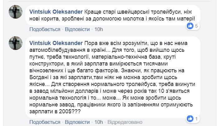Я так скажу: коли на зупинку підходить виготовлений у нас тролейбус, що їздить по маршруту "4" (зеленого кольору) - починаю сумувати, бо їздити у ньому неможливо через незручність і тісняву. Зробіть щось людське - з руками відірвуть, не треба мітингувати. А робите г. - хрєн ви мене заставити у ньому їздити тільки через те, що воно "наше". Що ж до мітингарів... Я, звісно, розумію, що керівництво заводу вчергове використало підлеглих людей як стадо заради своїх інтересів. Але чи хочеться й надалі бути стадом?