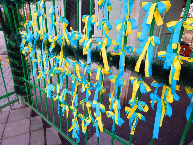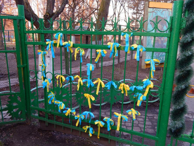 Вхідні ворота луцького зоопарку прикрасили патріотичними стрічками синьо-жовтого кольору у вигляді серця. Цей крок, кажуть у звіринці, свідчить про позицію працівників установи. Вони, мовляв, за мир і єдину Україну.