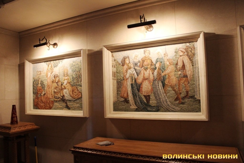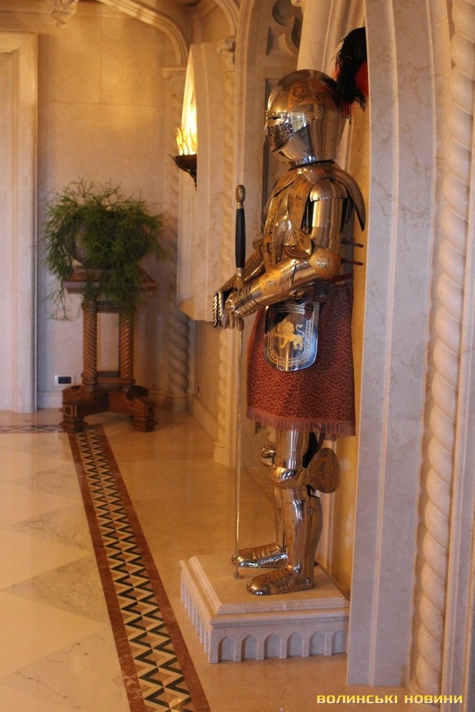 У залі стоять декілька лицарських обладунків, світильники стилізовані під смолоскипи, на стінах – мозаїки, склепіння нагадують середньовічний замок, є декілька скульптур, що зображують представників минулих століть. Вочевидь, тут господар хотів відчути себе королем Артуром. Враження середньовіччя порушує годинник, який тримає каріатида. Янукович, як ми це швидко зрозуміємо, мав, напевно, особливу пристрасть до великих годинників – вони є чи не в кожній кімнаті Хонки. Гладенькою мармуровою підлогою холу екскурсовод ходить у тапцях, проте нам дозволяє не знімати взуття.