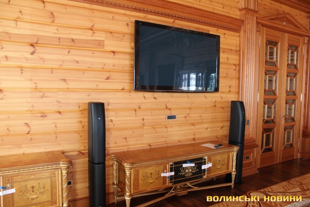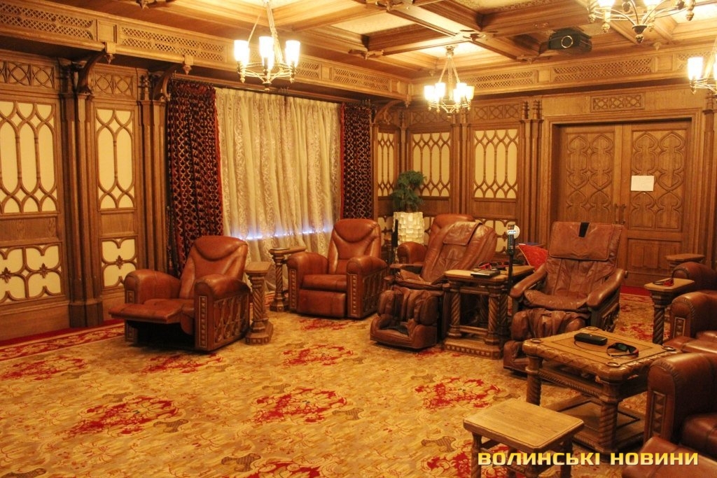 Далі прямуємо у оздоблений деревом приватний кінозал, де мало не цілу стіну займає телевізор Panasonic з величезною діагоналлю. Як пояснює Олесь, за бажання, можна закрити цю стіну кіноекраном – проектор зауважуємо під стелею. У залі – до десятка м’яких крісел, у них можна релаксувати, перемикаючи телеканали та увімкнувши функцію масажу. Розслабитися у одному з таких фотелів пропонують учасницям нашої екскурсії.
