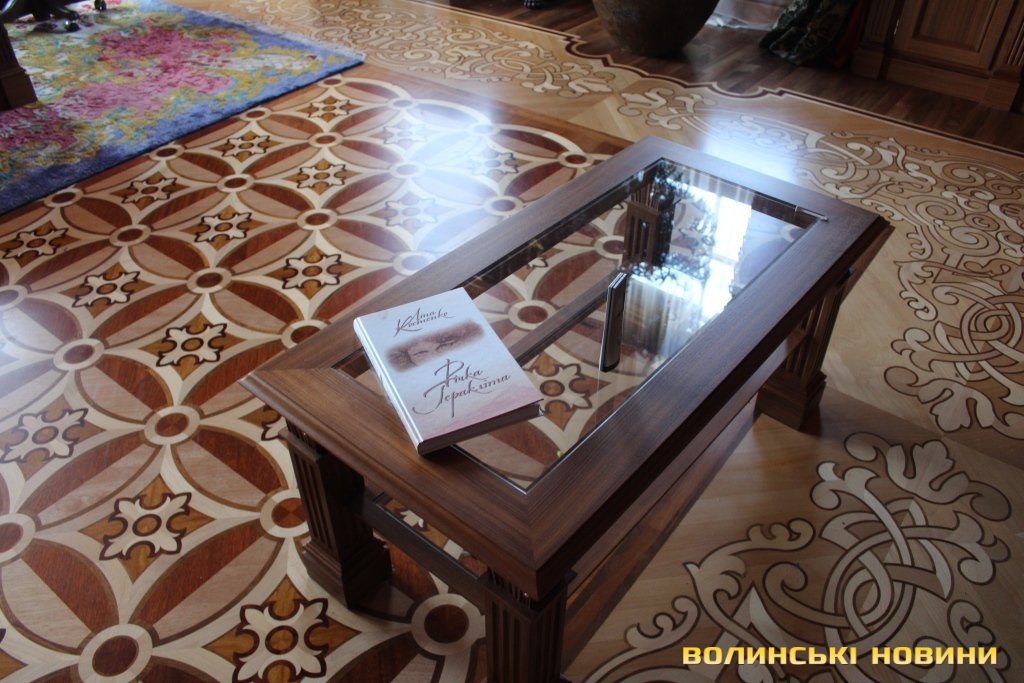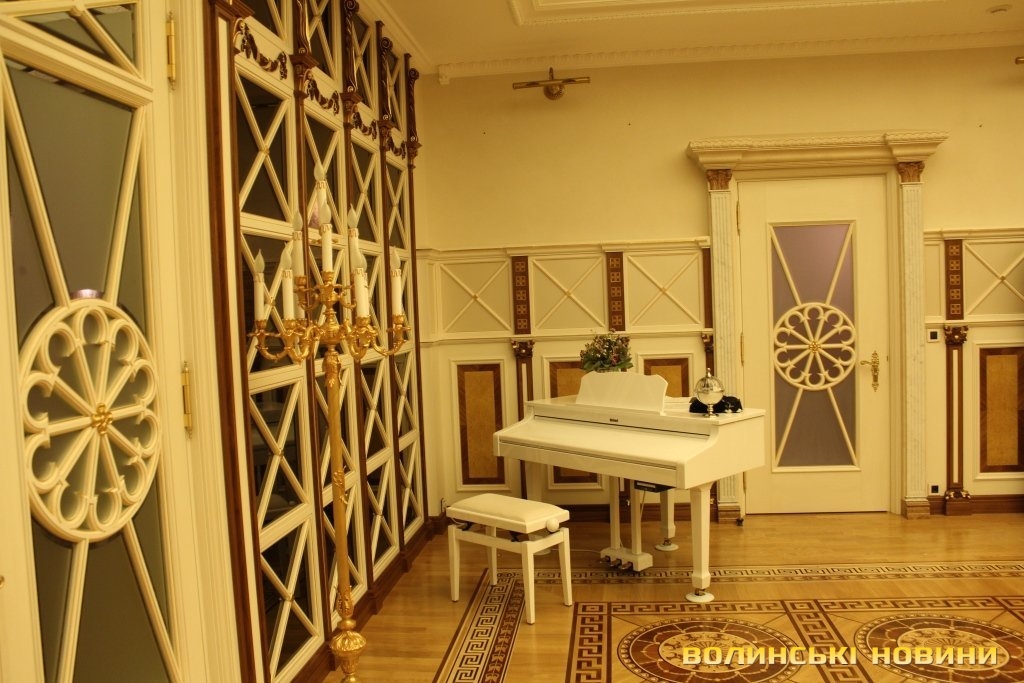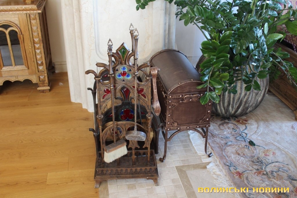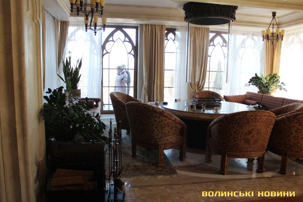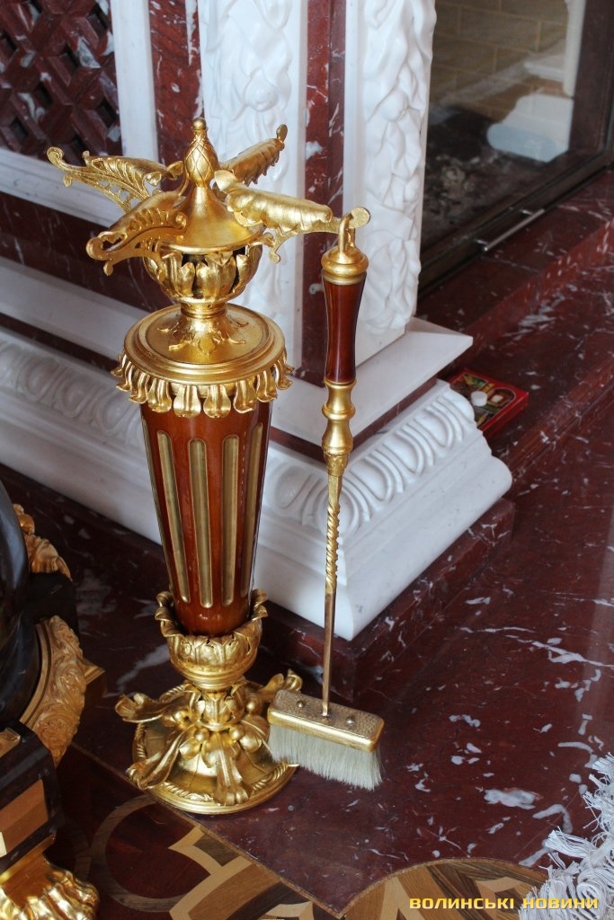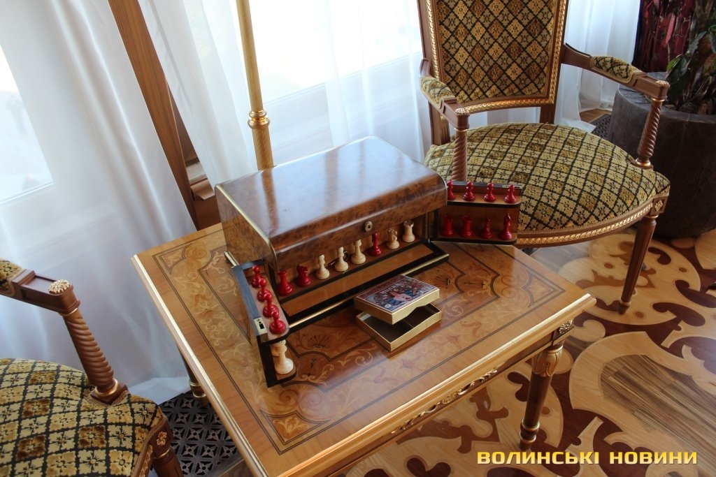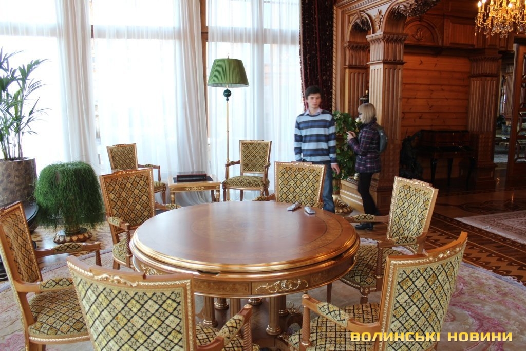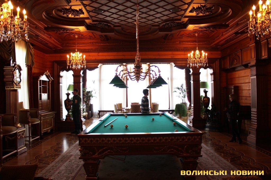 Поряд більярдна, у якій, окрім, власне, більярдного столу та колекції київ, виявляємо шахи (звісно, ексклюзивні, у спеціальній скриньці) та коробку для двох колод карт австрійського виробництва, оздоблених у стилі художника Альфонса Мухи. Вазони, позолота, круглий стіл для настільних ігор, камін із залишками дров – роздивившись усе це повертаємося до найбільшої кімнати. Рояль Steinway&Sons також колекційний, як пояснює Олесь, таких інструментів у серії, присвяченій Джону Леннону лише два десятки у світі. Кортить дізнатися, яку музику виконували на ньому за часів господарювання Януковича – Брамса, The Beatles чи, усе ж, «Мурку».