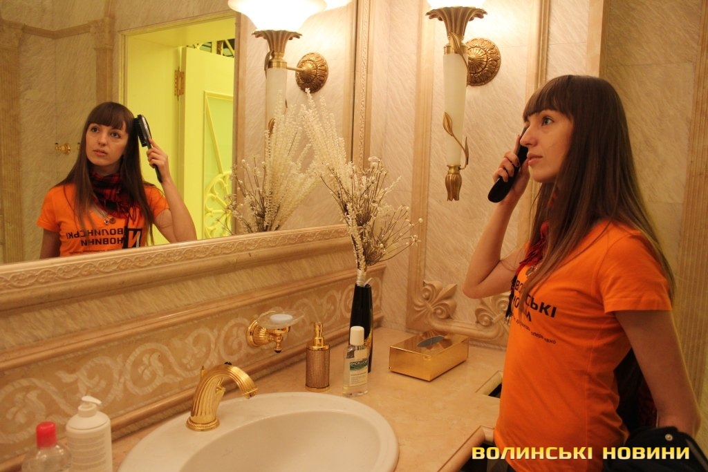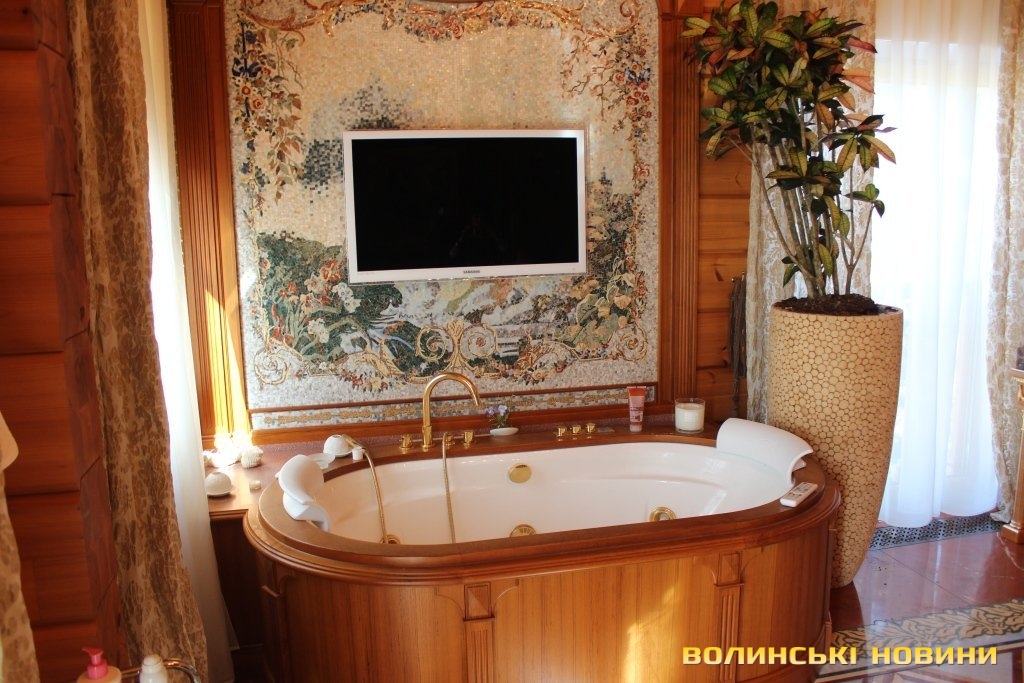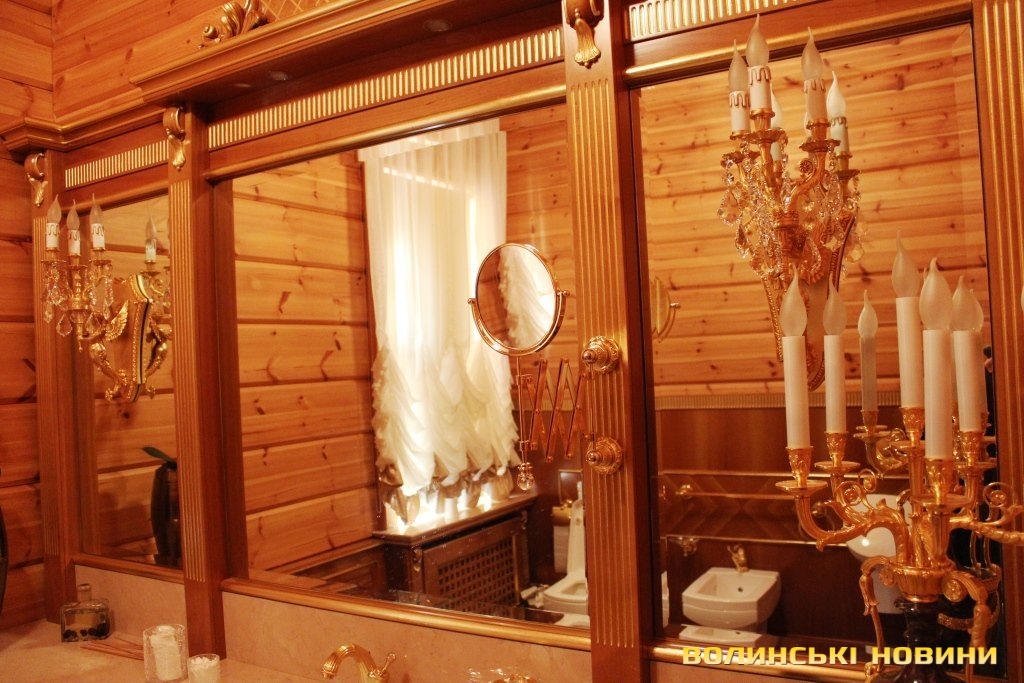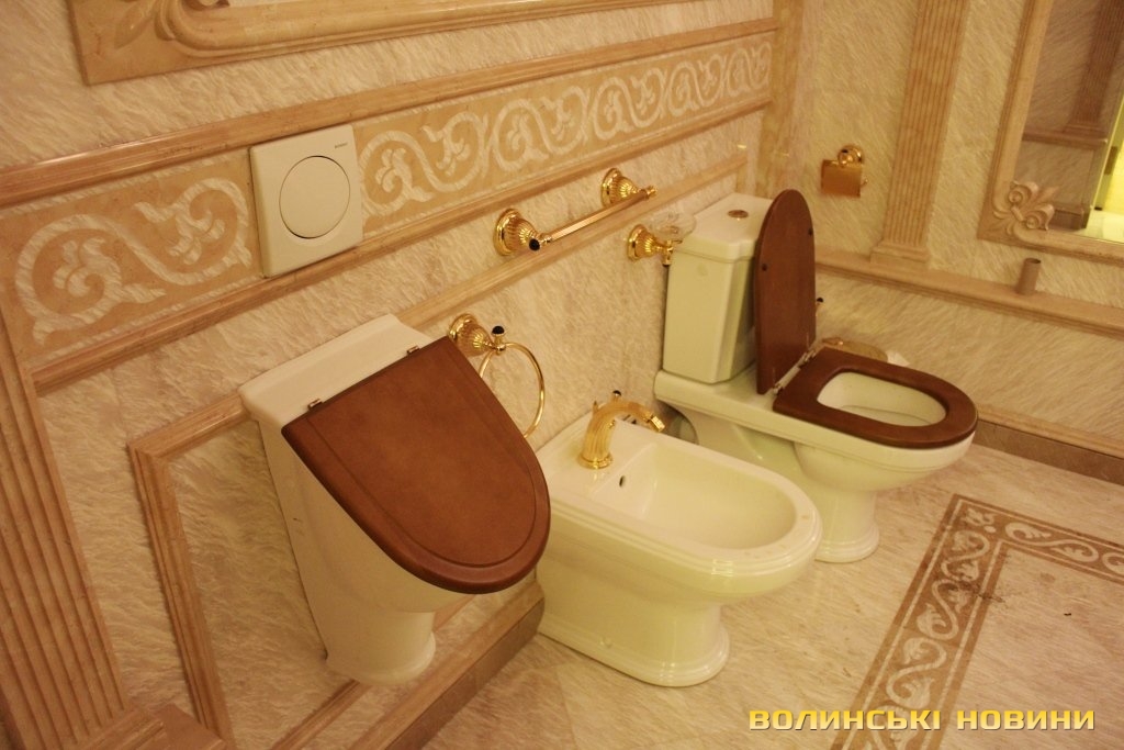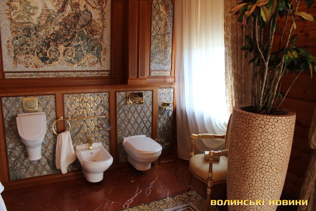 Заходимо до «царської» ванної кімнати – не кожен має мозаїку з павичами просто на стінах душової. До слова, душ також сяє позолотою. Поряд з душовою кабіною – пісуар, біде, унітаз та, чомусь, крісло. Для того, щоб в елітності власника Хонки не виникало сумнівів ні в кого, позолочена навіть щітка для унітазу. На підлозі – брудні капці господаря. Навпроти у просторому приміщенні – ванна, над якою телевізор Samsung, щоправда, значно менших розмірів, ніж у інших кімнатах. Цікава знахідка чекає на нас у одній з шухляд – десятки упаковок ліків, які вживав Янукович. Як зізнається Олесь, тут лише частина медикаментів. На п’ятому поверсі виявили цілу полицю, заставлену ними. В іншій шухляді жінки виявляють докази того, що екс-гарант фарбував своє волосся – рушники зі слідами фарби.