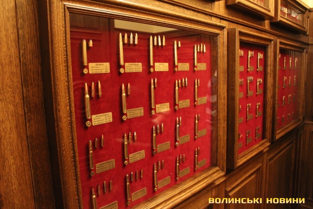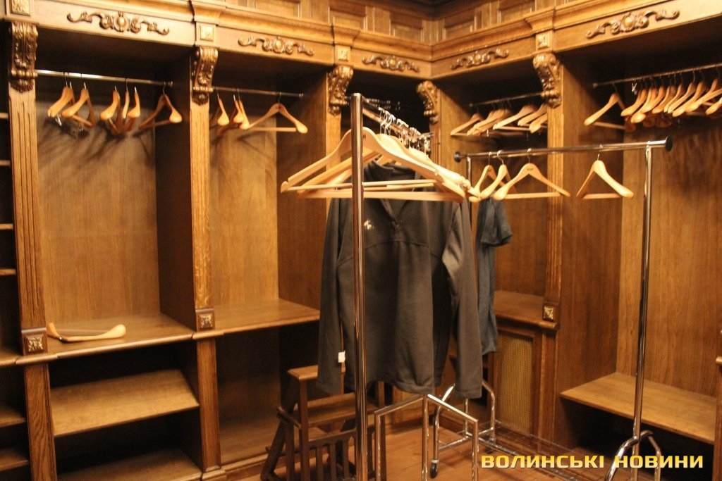Далі йдемо у напрямку гардеробу, проходячи кімнатою, на стінах якої – своєрідна експозиція бойових набоїв різноманітних фірм. Також тут є колекція бамбукових стріл та лук. Усі експонати – як у справжньому музеї, під склом та з табличками. Гардероб майже порожній, бачимо тут лише безліч вішаків. Як інформує екскурсовод, вивозили звідси практично увесь одяг, те що лишилося, можливо було забраковане господарем, або ж речам не вистачило місця у фурах. Приміщень для зберігання одягу у Хонці чимало, гардеробу Януковича міг би позаздрити найбагатший актор Голівуду. Гардеробна кімната, загалом, скромна у порівнянні з іншими приміщеннями у Хонці.