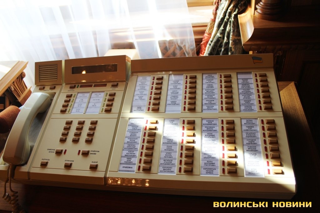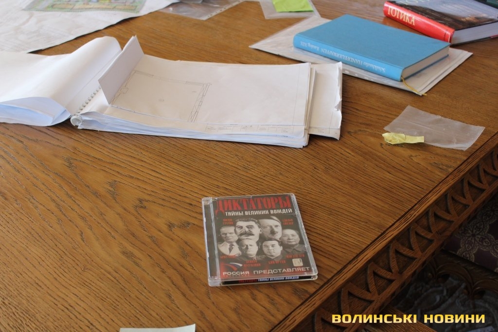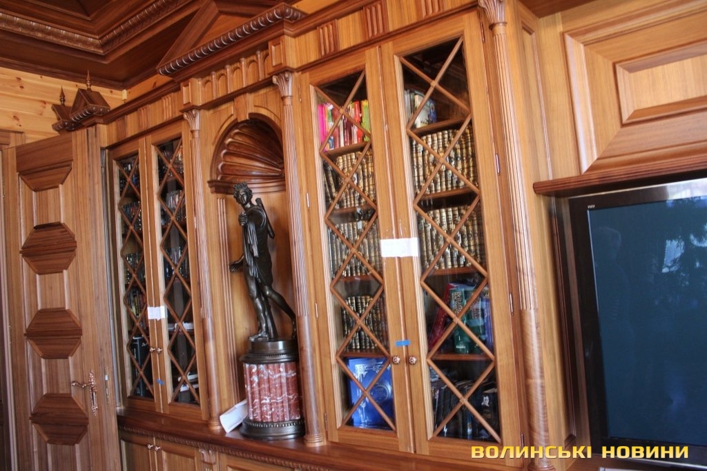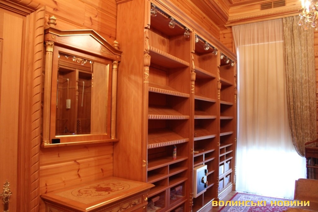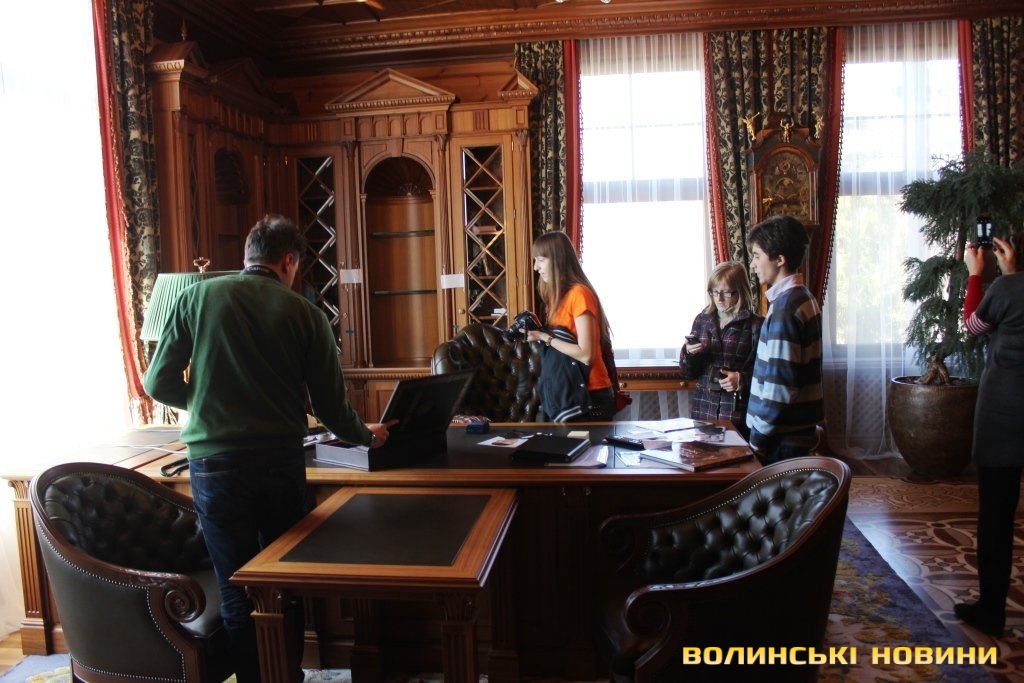 Сходами підіймаємося у президентський кабінет. Ще одна несподіванка – на журнальному столику лежить книга Ліни Костенко «Річка Геракліта». Хто її читав, назавжди залишиться загадкою. Високий годинник з позолоченими фігурками міфічних істот, екзотична рослина у вазоні, ще один телевізор з великим екраном, на полицях за склом – сотні книг. Шафи опечатані, на корінцях можна прочитати твори світових класиків, сучасних письменників, фантастів. Дос Пассос, Лем, Екзюпері, Діккенс – сучасні видання у перекладі російською. Стародруки вже, ймовірно, вивезли у музеї. На робочому столі – журнали, ілюстровані книги, серед яких фоліант «Гроші України», папки з якимись паперами. Олесь демонструє, як можна завісити вікна за допомогою пульту. Величезний комутатор прямого зв’язку з урядовцями та іншими можновладцями-регіоналами. Кумедно, що дехто з тих, чиї імена вказані тут (Віктор Пшонка та Віталій Захарченко), також переховується від правоохоронців. Зелена настільна лампа з позолотою – без неї, звісно, виконувати обов’язки Гаранта неможливо. У порожній нині коробочці, як розповідає Олесь, раніше зберігалася кілограмова золота монета з портретом Януковича. Екскурсовод нагадує, що під час останньої прес-конференції в Ростові-на-Дону екс-президент стверджував, що цей будинок – не його власність. Офіційно Хонку орендувала фірма «Танталіт», а де-факто саме тут мешкав Янукович.